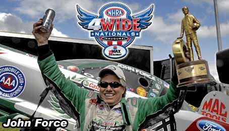 NHRA zMax: The first ever 4-wide competition race happened in Charlotte this weekend. Sunday was again plagued by rain, though all finals were finished up earlier today. Mike Edwards would continue is tare in Pro Stock, Matt Smith would take PSM, Cory McClenathan in Top Fuel Dragster and John Force in Funny Car. Coverage recaps on Dragzine.com, official coverage on NHRA.com, additional coverage on CompetitionPlus.com and DragRacingOnline.com