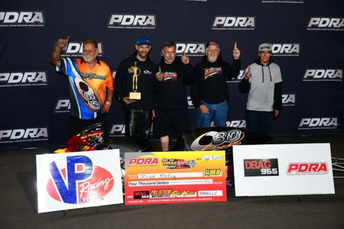 For the first time this season, someone other than defending world champion Eric McKinney or points leader Travis Davis won in Pro Extreme Motorcycle. Coincidentally, Brad McCoy had to race McKinney and Davis on his way to the PDRA Drag Wars winner’s circle. McCoy rode his Q80 Racing Hayabusa to low et of the event, 3.998 at 176.49, to beat McKinney’s 4.04 at 178.50 in the final round.