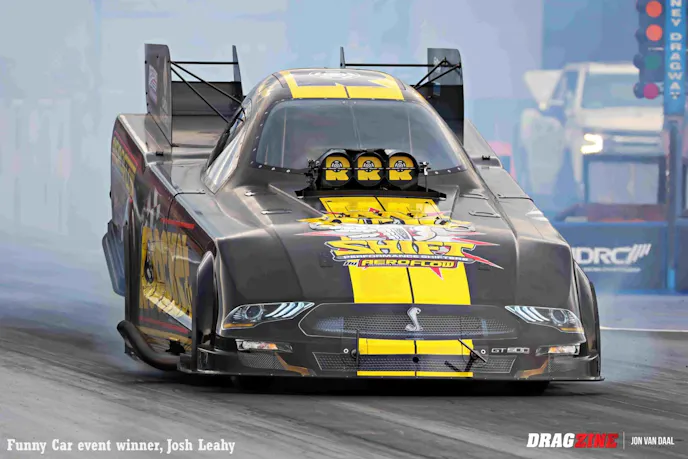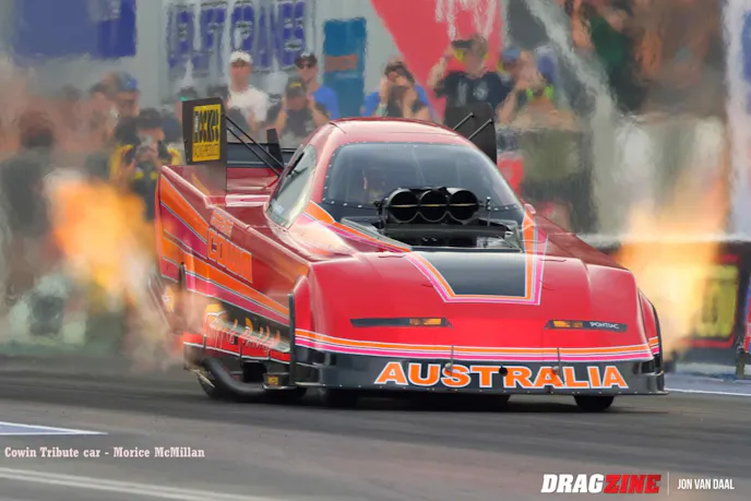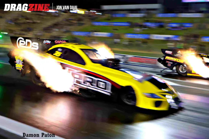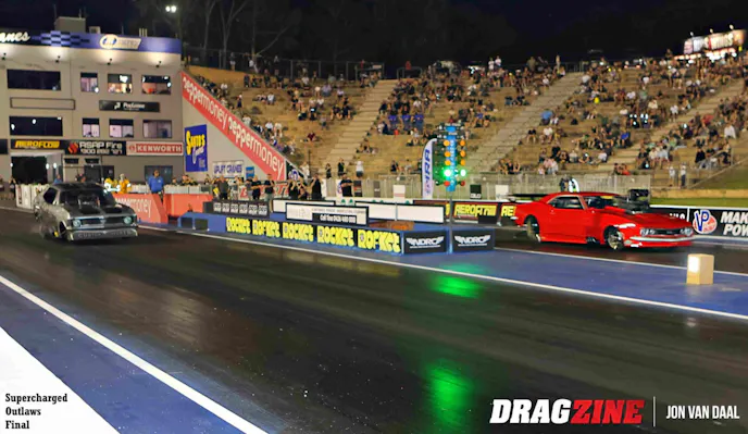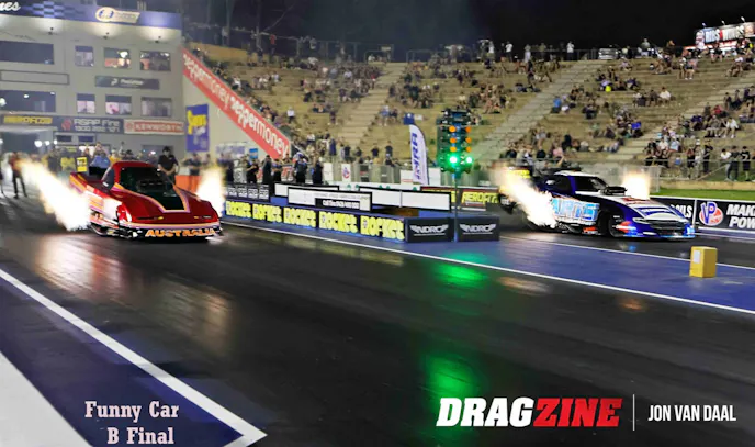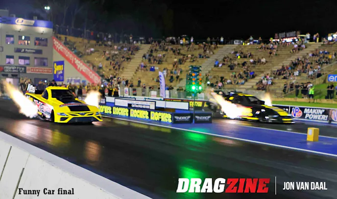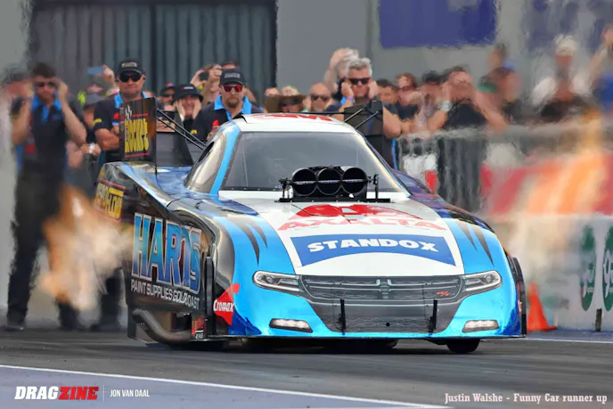 Backing up the Nitro show were 110 hand-picked sportsman racers from all over Australia. When all was said and done, victories went to Mitchell Oxley in Super Comp, over runner-up Kit Hunter. Wally Hosta won in Performance Bike, over runner-up Ken Collin. Cory Dyson took the gold in Modified from runner-up Jess Turner. Super Sedan had Michael Vlasakakis snatch victory over runner-up Sean Maher. In Super Street, Tex Griffiths turned back runner-up Richard Matosevic, while Sean Rickets rode to a win in Modified Bike over runner-up Mitchell Woodford.