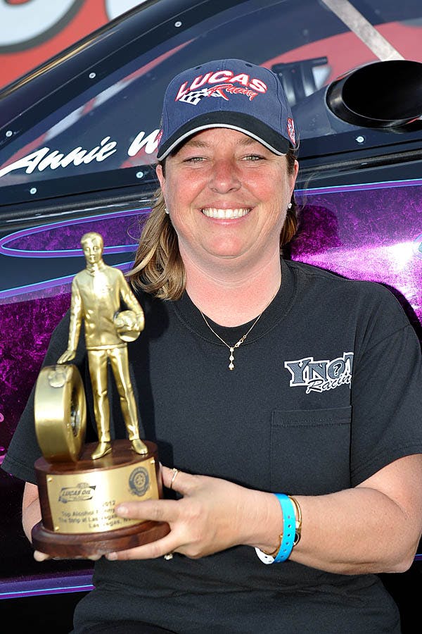 In just her fourth start in a Top Alcohol Funny Car, rookie Annie Whitely got her first win, upsetting heavily favored Tony Bartone in the Las Vegas