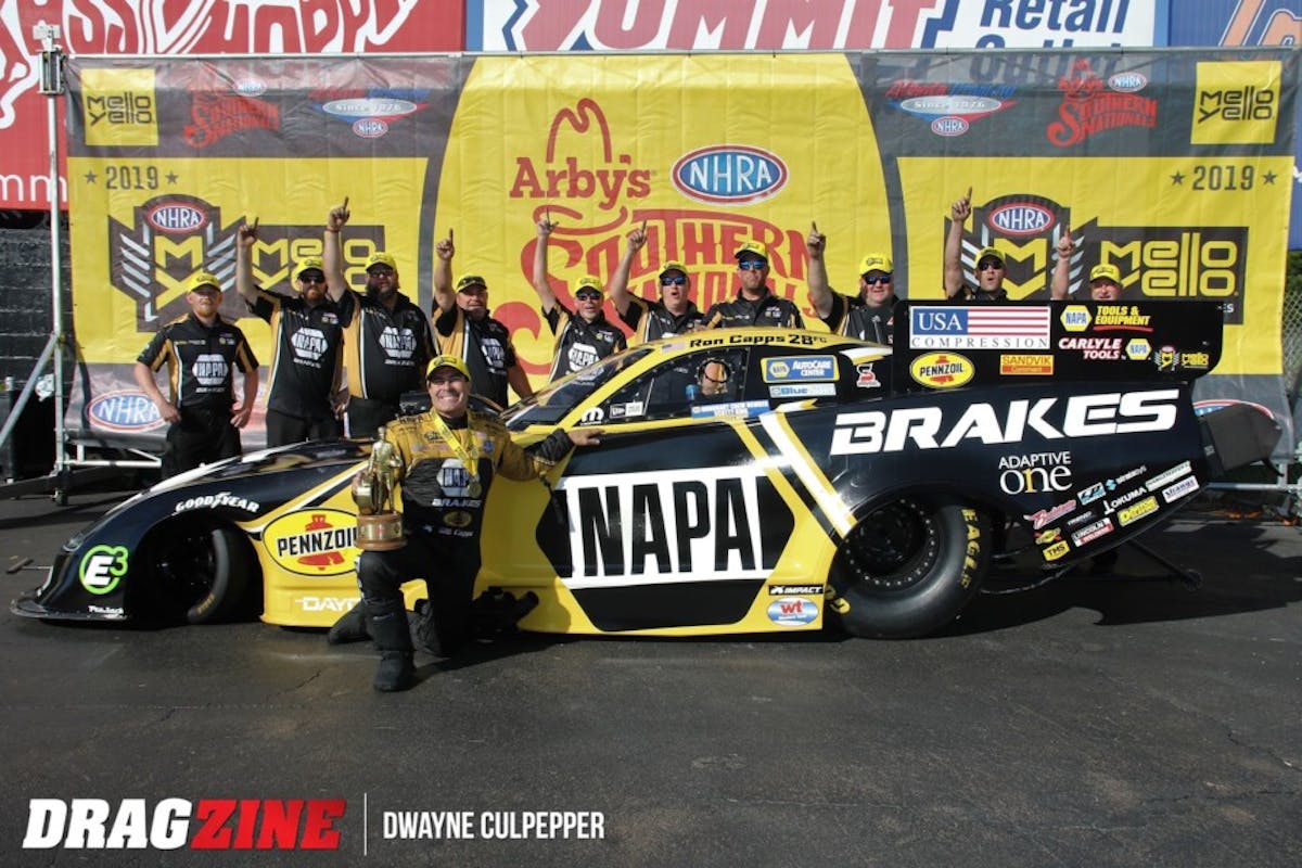 In Funny Car, Capps secured his first win of the 2019 season in his NAPA Auto Parts Dodge Charger SRT Hellcat, going 4.068 at 315.34 to win on a holeshot against Tim Wilkerson’s 4.052 at 310.05 in the final round. It also gives Capps his 62nd career victory, continuing his impressive string of 11 straight seasons with at least one win.
