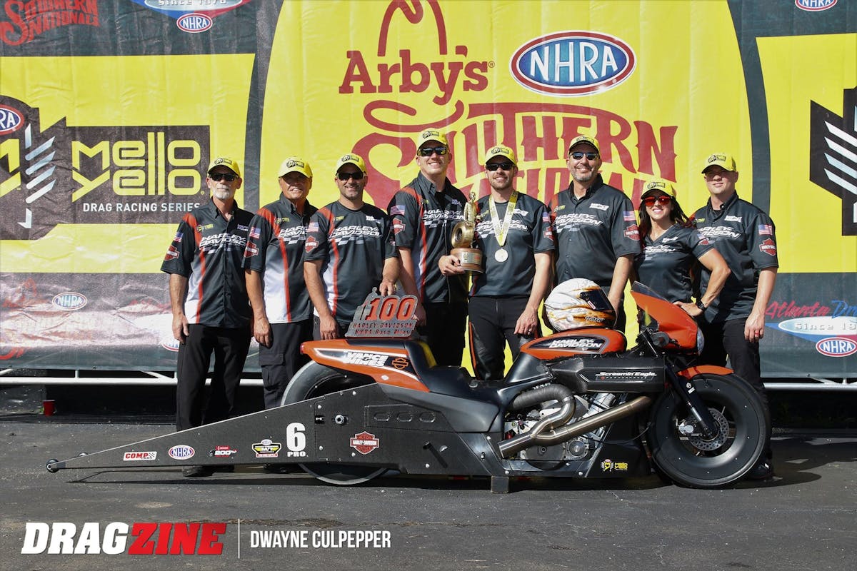 “It was a good day and my motorcycle is nothing like I’ve ever had in my career,” said Hines, who now has three wins at Atlanta Dragway. “It’s working really well and doesn’t do much wrong. All in all, it was a fantastic day. To get 100 wins for Harley-Davidson, it’s monumental. It was a very big struggle at first, and there’s been trials and tribulations, but it’s really nice to get the 100th.”