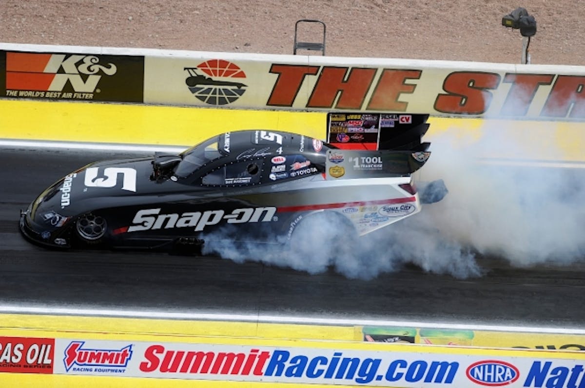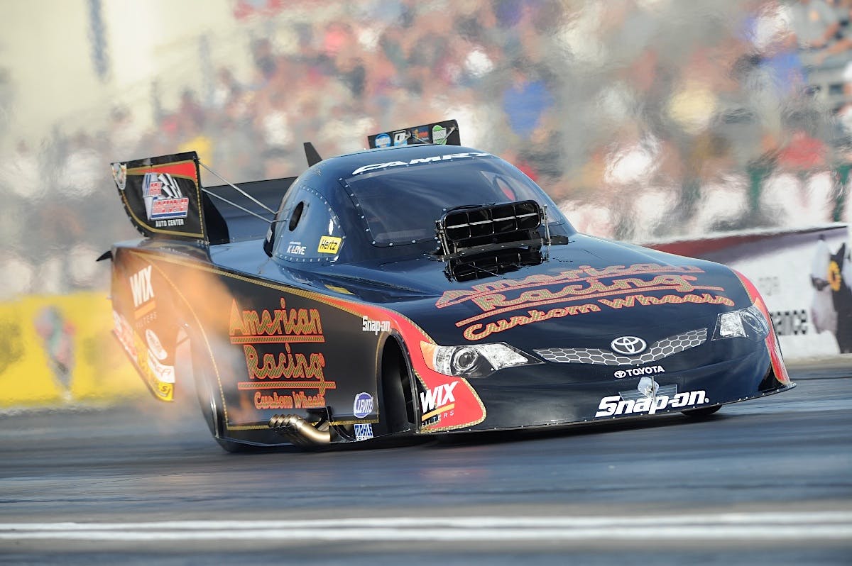 Independent Funny Car owner-driver Cruz Pedregon decided at the end of 2012 to serve as his own crew chief for the Snap-on Toyota Camry. The money he would save in salary would buy more or better parts. ‘What can I say? I needed the money,” he said. He also needed a victory, which came against Courtney Force and her Traxxas Ford Mustang in the final round. She was the No. 2 qualifier; he started fifth. “I’m proud of our Snap-On Toyota team,” said Pedregon. “I was so impressed with our consistency and the way our guys handled our turn-arounds on 50 minutes. We said, ‘Let’s not get crazy out here. Let’s just race the track and be smart.”