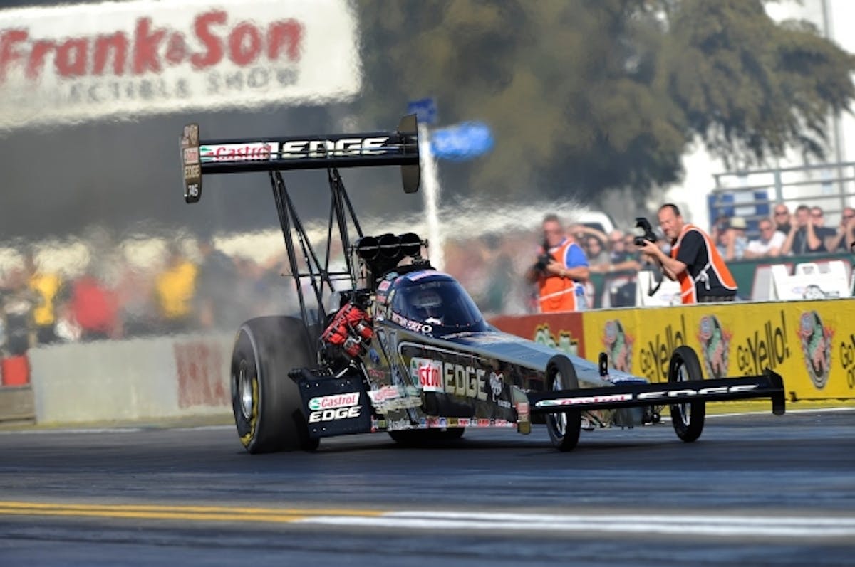 But Pedregon’s first victory of the season and his 31st overall came not without drama. At the end of his burnout, he couldn’t get the car in reverse. He credited both the NHRA official who saw his wave his hand in distress and his team which dashed out to him and pushed the car back to the starting line.