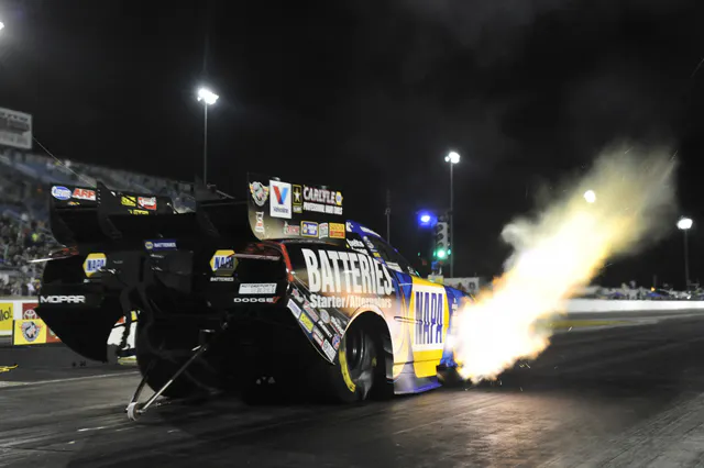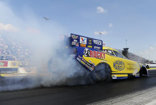 Capps unleashed the first three-second pass of the year, driving the NAPA Dodge Charger to a 3.988-second elapsed time at 320.88 mph. That pass was third-quickest in Funny Car history. Also lowering his personal-best times into the threes was Bob Tasca III, driving the Motorcraft/QuickLane Shelby Ford Mustang, who matched Capps’ 3.988. Capps kept the No. 1 position because his speed trumped Tasca’s 316.97 mph. Capps became the eighth pro driver Saturday to set a track record. He and crew chief Rahn Tobler still claim the quickest with Capps’ 3.964-second run last June at Englishtown, N.J. Del Worsham and Jack Beckman also joined Funny Car’s three-second club.