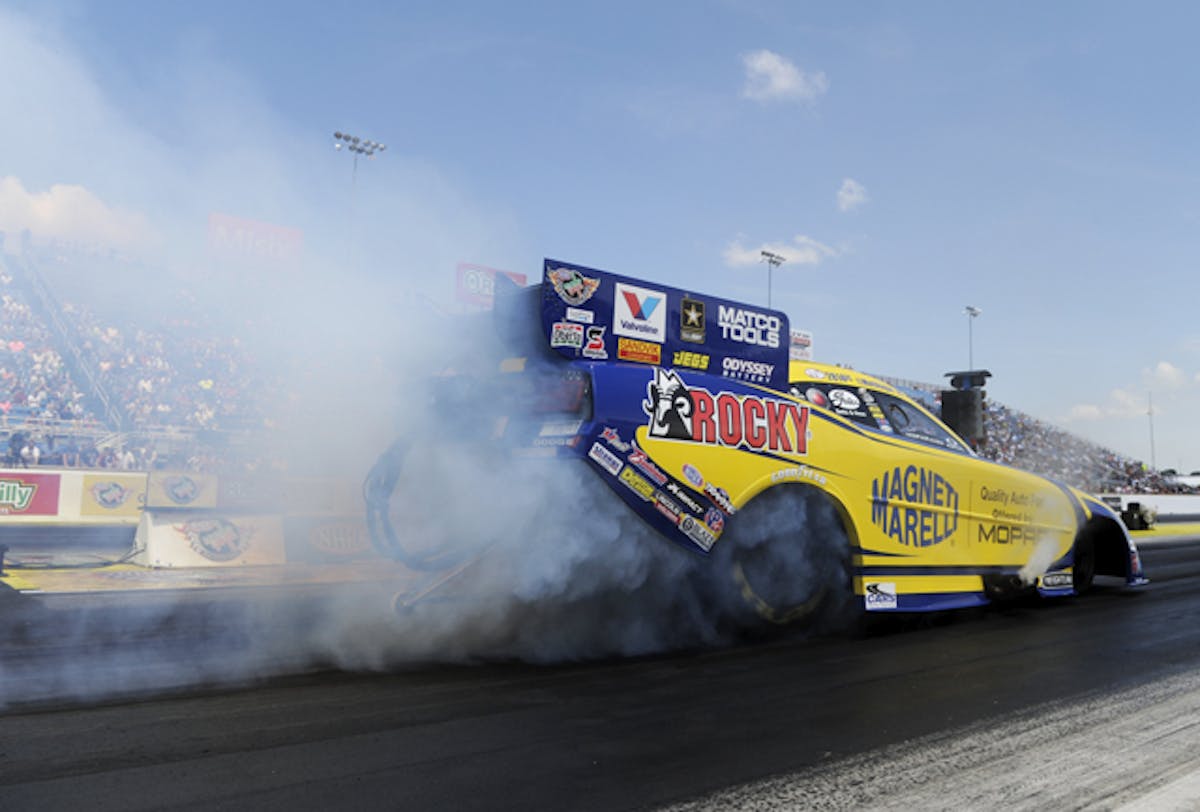 HAGAN GETS BETTER DEAL – Matt Hagan felt cheated Saturday night, but he made up for it Sunday. The Mopar/Magneti Marelli Dodge Charger driver was in the final pairing of Funny Car qualifying late Saturday night, when the timing lights cut out. That forced him to shut down, then refire his car. “The clutch was nuked after that,” he said, disappointed that he didn’t get to join four others who dipped into the three-second-E.T. range. The only thing that could make the points leader feel better was winning. So he did that, defeating John Force in the final round with a 4.065-second, 315.34-mph run.