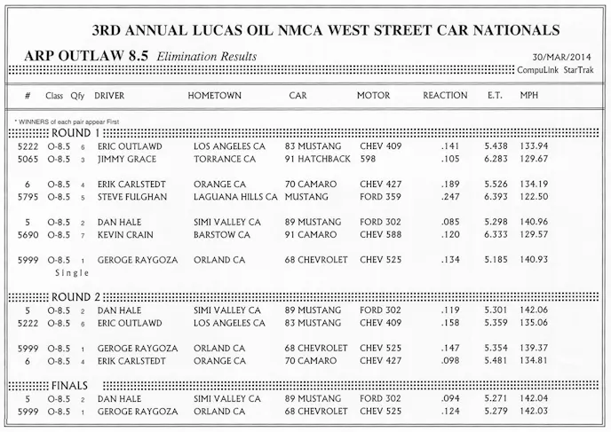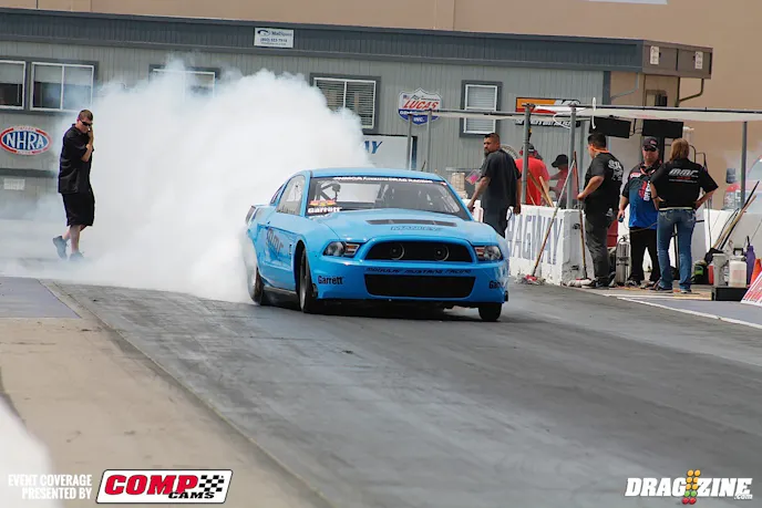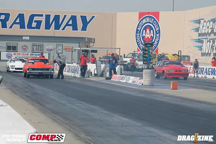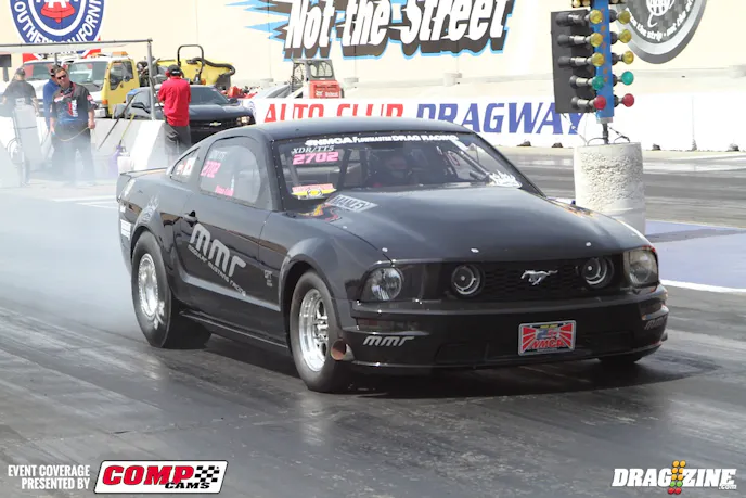 NMCA West’s eighth-mile really-small-tire class drew seven entries at Fontana, with qualifying led by George Raygoza. His 5.160 pass was followed by Dan Hale at 5.375, Jimmy Grace with a best of 5.393, and Erik Carlstedt at 5.513 to round out the top half of the field.