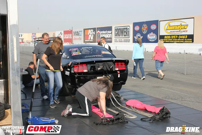 Dana Cook (center) and company pack the parachute on her MMR-prepped Stang on Saturday. She had the car’s boost increased slightly for the day, in the hopes that the alteration would help get the car out of the box faster. Cook has been taking the boys to task for over five years now, and she definitely put on a strong showing this weekend. She wound up coming in as runner-up in the TT5 class.