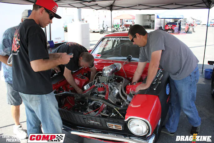 Erick Aldrich (holding cell phone) and his team get ready for the upcoming round of Outlaw 8.5 racing. This would be Aldrich’s first time back in NMCA since 2012, and he was eager to strut his stuff on the dragstrip in his supercharged ’72 Maverick.