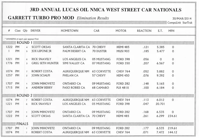 The Pro Mod money round saw Mihovetz on the losing end of a one tenth holeshot from Costa, but traction, not reaction, decided the winner. Both drivers were in and out of the throttle all the way down the track, with Mihovetz ultimately able to pedal a bit better and skate to a 6.535 to 7.472 win.