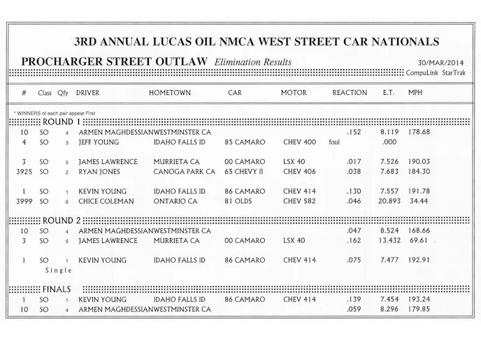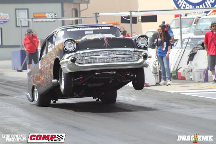 While his crew had done everything possible in the time available to get the gravel out of his Chevy, when Lawrence and Maghdessian paired up to see who would face Young in the finals, there was still enough left to cause problems. At the hit the Camaro was all over the place, making several big swings side to side and nearly contacting the wall before crossing the center line, fortunately far behind Maghdesssian. That set the final round pairing, and when the moment of truth came, Young’s leisurely .139 light wasn’t a factor – Maghdessian stood his car up again, while Young ran hot, straight, and true to the finish line, winning Street Outlaw 7.454 to 8.296.
