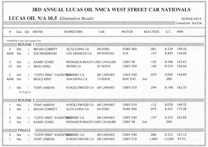 Defending class champ Tony Aneian led N/A 10.5 qualifying with a best of 8.122 at 168.37 miles an hour, with Gypsy Mike Valentino second at 8.226, and Randy Jones third at 8.262 in the seven car field.