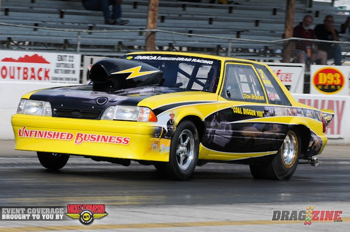 John Kolivas is in the house this weekend, and any time the white Mustang is in the field, things are sure to be interesting. As a many-time NMRA champion, Kolivas has had a number of great moments here at Beech Bend, and he’ll look to add to his run here in Street Outlaw with his single-turbo, small block Ford combo.