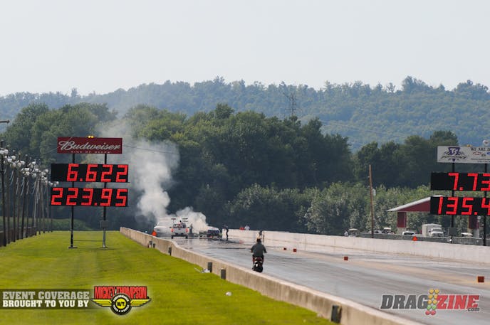 In the semis of Pro Street, Clint Hairston, who’s nursing a wounded race car after an engine change last night, took the tree on his competition single and coasted won the track into the final. In the other pairing, however, Jeff Lutz dropped the hammer on low elapsed time of eliminations, a 5.99, to take down a slowing Jim Widener. In Street Outlaw, Sean Ashe lost traction just off the starting line, while his opponent, John Kolivas, brought his A-game, making his best run of the weekend at 7.38 at 192 mph to advance into the final. Kolivas will have lane choice when he meets Jason Lee in the final round a little later today.