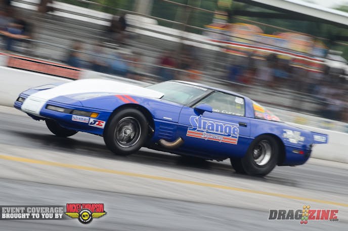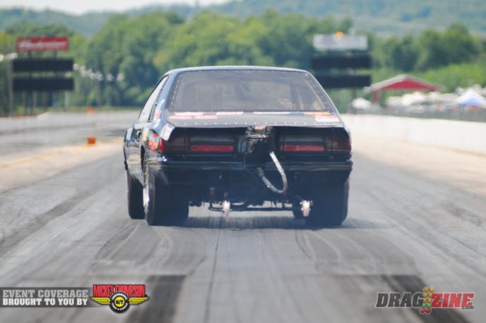 Brian Campbell put his ’96 Ford Mustang on the bumper this morning and bettered his class-leading effort in Mean Street, running 9.84 at 135 mph. Don Baskin remains second with his 9.89.That is indeed Jason Lee’s Strange Engineering-backed Street Outlaw Mustang with the wheels HIGH in the air as he neared the half-track mark. Lee’s machine had gone skyward at the hit, and after briefly touching down, began to climb once more, eliciting a huge applause from the crowd here at Beech Bend.John Warren, who took over the Xtreme Street qualifying lead with his 7.93 this morning, bettered his standing in the final session with a 7.89.