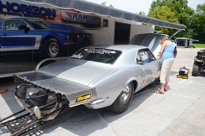 For reigning NMRA and NMCA 10.5W champion Mike Murillo, it's been a season marked largely by frustration. After engine woes in the early part of the year diagnosed as an issue with the camshaft, the team rebuilt the engine prior to the Joliet race, and then broke it again on a testing pass, snapping the crank 5.8-seconds into a strong 6.62-second blast. The engine has been put back together and Murillo is much more confident that his struggles are behind him. Jim Widener scored his first NMCA Pro Street victory in convincing fashion in Joliet, running a consistent string of low six-second laps. Widener admits his combination is geared toward the heat, due in large part to the design of the aging Cougar chassis in which the engine is set back several inches further than usual. “The car reacts well in the heat, but in the cooler weather, it really wants to carry the wheels.” Widener said the plan this weekend is simply “to go A to B”, and if his bracket-like consistency in Joliet was any indication, Widener might have another “Wally” trophy to put on his mantle at the close of the weekend.Outlaw 10.5 racer Peter Campbell and his wife drove 26 hours drown from their Canada home to make their NMCA Super Street 10.5W debut this weekend. Campbell had plans to attend the Joliet race, but family issues to tend to delayed the debut. The Camaro sports a 540 cubic inch Nelson-built engine with a pair of 88mm turbos. Campbell has been in the 6.90’s with the combination.Jeff Lutz put the first “five” on he board in the opening session of Pro Street qualifying, going 5.999 at 250 mph to grab the early lead. In the opposite lane, Joliet winner Jim Widener carded a nice 6.14, good for second in the order.Chuck DeMory Jr. is making his second Pro Street start of the season this weekend with his ProCharger-equipped GT500 fastback Mustang. DeMory has been working on his new combination for over a year since switching from a nitrous combo in Nostalgia Pro Street to Pro Street. According the second-generation racer, the F3 ProCharger and RaceDrive combo are making good power on the top end, but they’ve had to creep into it down low. The car recently carded a 6.37 during a test session in Michigan. In the opening session today, DeMory drifted out of the groove, and almost saved it, but ended up brushing the wall with the drivers side of the car, leaving some battle scars and a flattened ‘bullhorn’ pipe.