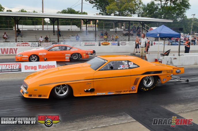 Jeff Lutz stepped it up in the overcast second session of Pro Street qualifying, running straight-and-true to a 5.97 at a booming 249 mph.