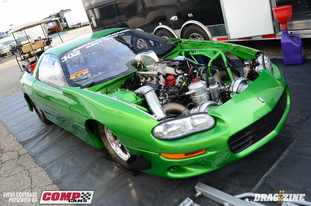 Boca Raton, Florida's Gary Lee has his 2002 Chevrolet Camaro on the property to compete in Radial Wars this weekend with noted LSX racer David Adkins behind the wheel. Completed earlier this year, the duo has made an estimated 10 runs on the car this season at the Holley LS Fest and the Shakedown at the Summit in Norwalk last weekend. The Camaro features an LSX454 for power (a bullet formerly campaigned by Paul Major in his Drag Radial Corvette), with twin 88mm Bullseye turbos out front, transferring through a Rossler transmission. As Lee shared with us, the car is full stock-style suspension front and rear, with a Racecraft torque arm setup in the rear and Strange Engineering shocks on the nose. The team has been 4.70's already, with hopes of carding some laps in the 4.30's to 4.40's this weekend. T.J. Grimes is on hand to help tune the car.