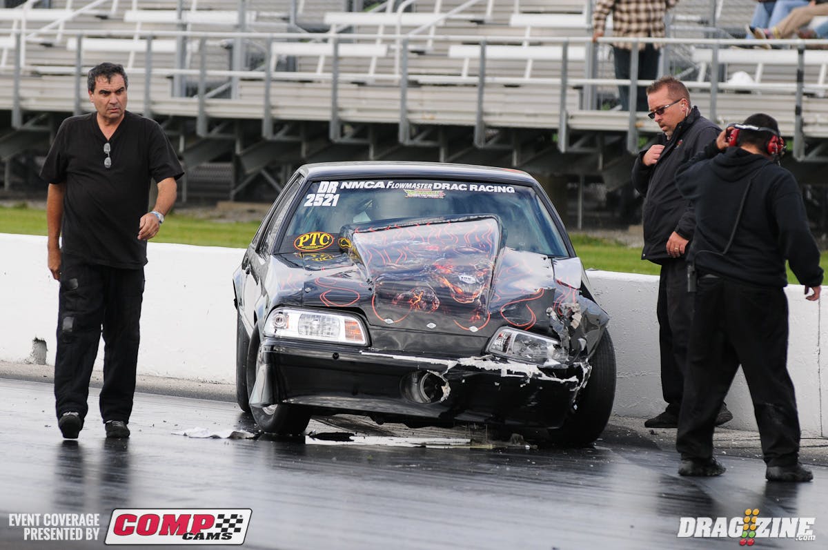 Nitrous Pro Street racer Don Rayburn went for one heck of a ride when his short wheelbase Gremlin took an abrupt turn just off the starting line. The impact hung the throttle, sending the car careening across the track where it rolled over on top of the wall and came to a rest on all fours.