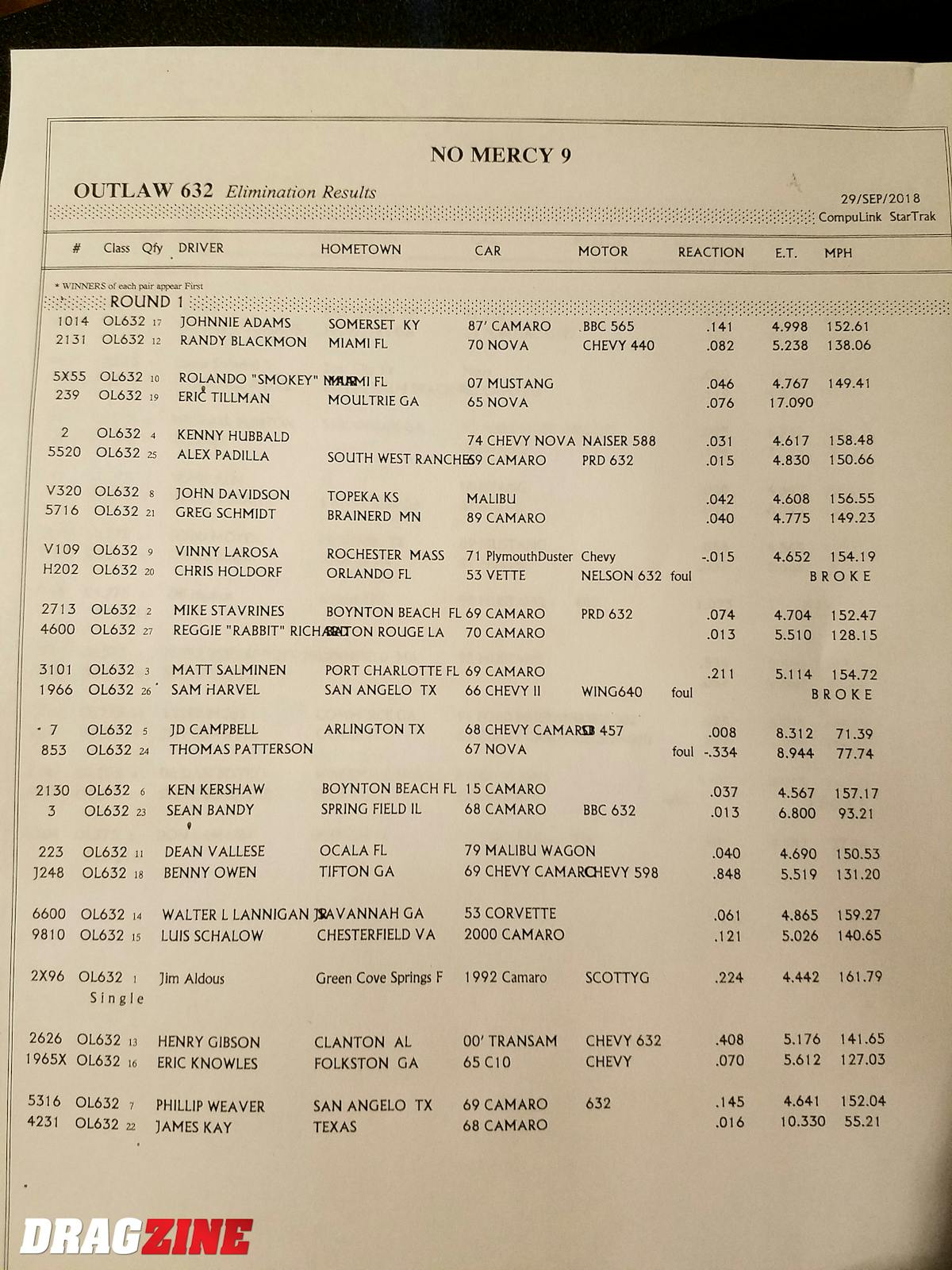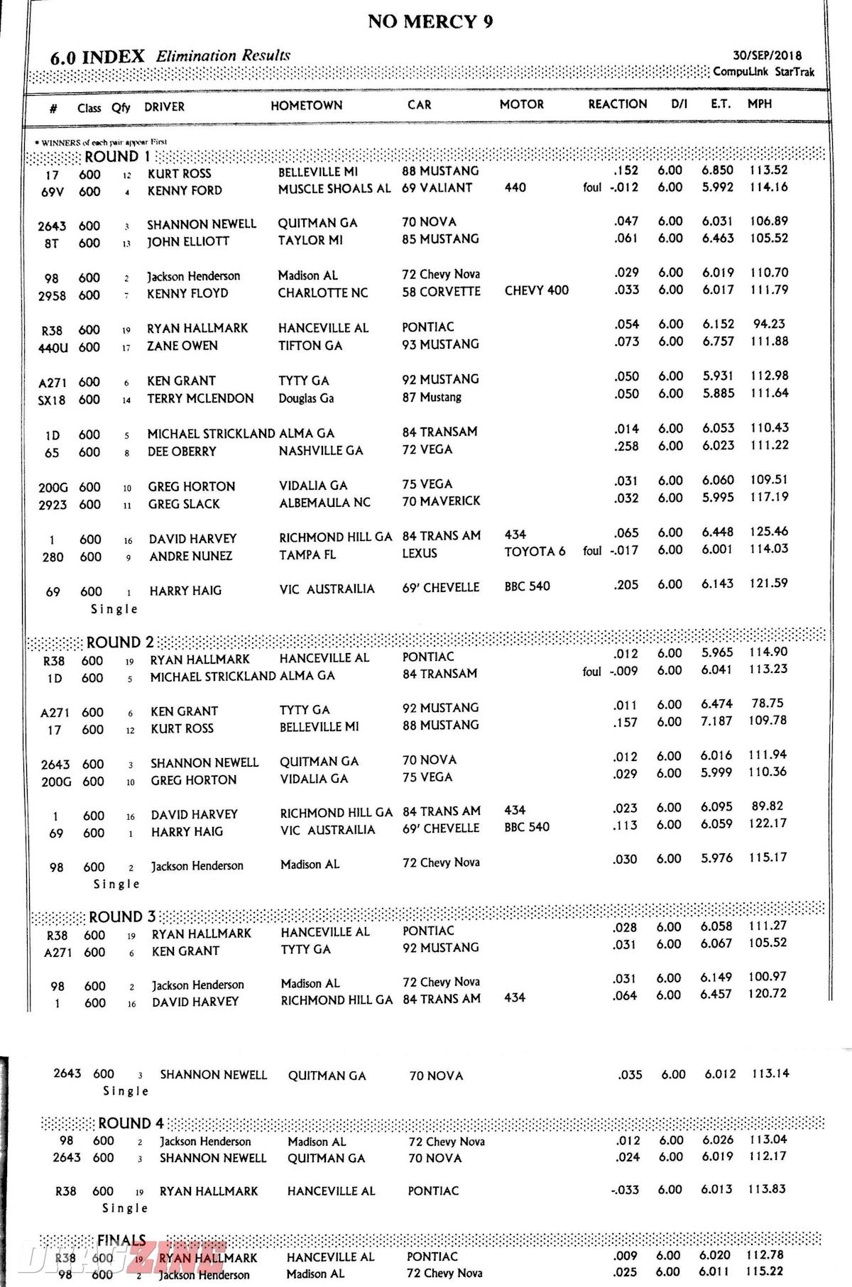 Phill Bohley is the No Time 315 winner over Timmy Miesner who rode out a wheelie a little too far and could not keep up with Bohley’s Savage.Jason Richards is the No Time Extreme 28 winner at No Mercy 9 after facing off with 6 Mile Randy in the Holy Ghost. “We had a rough weekend having to put rings in the engine twice and work out butts off but it paid off in the end. Our most critical round was the final, I got luckiest in the final.We both spun the d tires and I was able to pedal it and get the win. Thank you to my dad Charles and my brother Charles Jr and mom, my girlfriend they all help me out to do what I do and keep this thing going. They all worked hard to get the engine repaired twice and make the next rounds we needed.” Jason RichardsTroy Pirez Jr debuted his new truck “Stonewall Jackson” this weekend at No Mercy 9, the first big event for his new build. The S-10 was built in one hundred and eighty-one days, starting the build four days after winning Lights Out here in February, making this two for two for Team Pirez in the Small Block NT Shootout. The truck had just twelve passes on it before the event. “The most important round was the semi finals, it felt like the finals to us. That was our round where we had to cross over the hump facing off with Sub Zero.” – Troy Pirez Jr. Troy Jr. owns Innovative Racecraft and gets power from Fast Forward Race Engines and PKRE.The 6.0 Index was a tough field and five rounds of racing that came down to a big tire vs small tire match with Ryan Hallmark scoring the win in the Joker Firebird over Jackson handerson’s 72 Nova. A ,.009 reaction was a big advantage for Hallmark allowing him some room at the stripe. He was 6.020 to Henderson’s 6.011.Open Comp winner was dialed 5.93 for three rounds today meeting in the final with Bobby Taylor Jr.