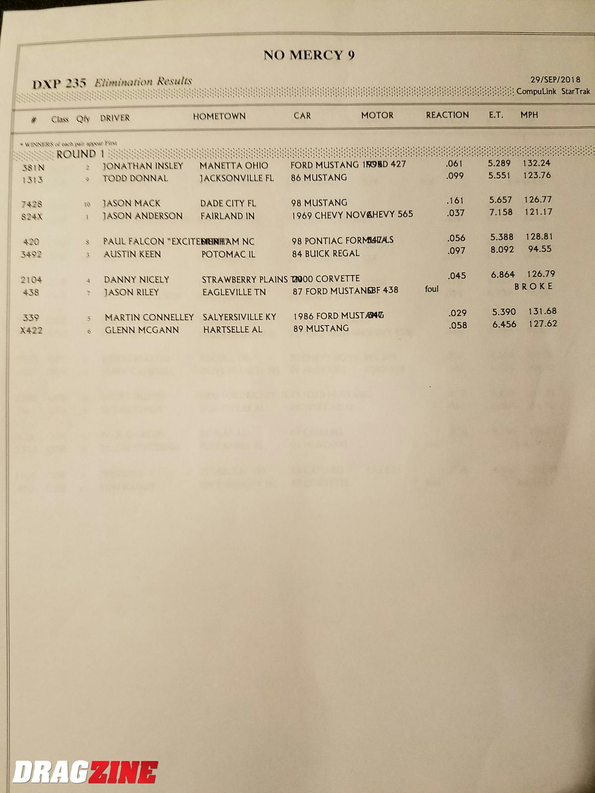 DXP 235 Winner is Jonathan Insley He runs a 1995 Mustang with a 440 inch Windsor with a Nitrous Express plate system and RPM Transmission powerglide with an Ultimate Converter Concepts converter. The engine is from Toby at Cunningham Motor Works in Charleston, West Virginia. Thanks to Kuntz and Company for the cylinder heads, a killer set of Brodix Track 1’s. The chassis was built by Rogue Race Cars and we did the fabrication work in house. My most important moment today was against Martin Connelley in round two, he is a tough tough competitor, probably the toughest guy in the class. When you beat those guys you beat the best they have a great crew, I mean I’ve got a great crew but beating those guys made our day a little bit easier. My crew is Matthew Riley who wired the whole car, he’s a great mechanic and fabricator, Greg Harrell, Matt Jarrell and Jason Anderson. I want to give a big shout out to Elite Automotive in Indianapolis Jason’s shop, awesome on tuning, he is a big reason we got the car where it is today as far as getting the chassis lined out and the tune ups set up. Pushing me to get out there and get it done. He is usually always the bug that’s in my ear.” – Jonathan Insley They had a two car team here this weekend qualifying number one and two with Anderson scoring top qualifier.