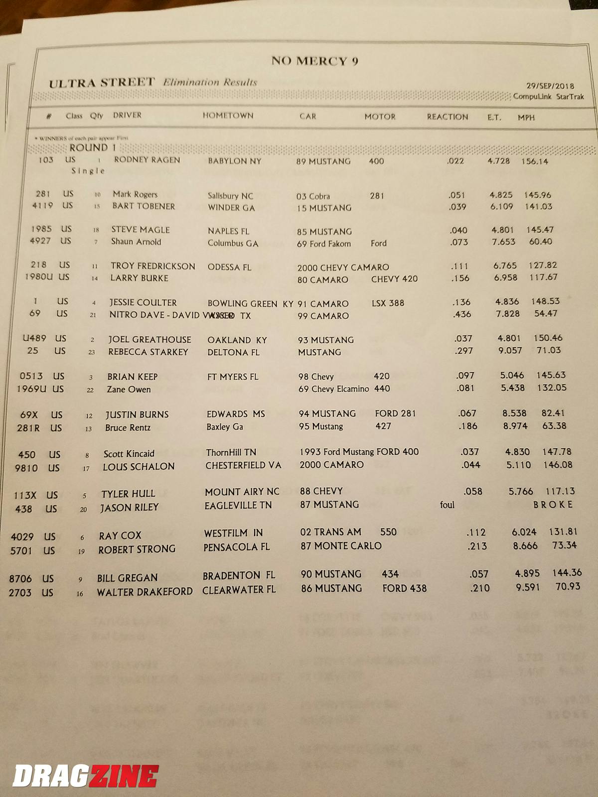 Rob Goss finished up his NMCA Street Outlaw season last weekend scoring third place in points on the year. He stopped off at BES to swap in the new bullet suffering a little piston damage to the NMCA specked engine in Indy. The new one is a cast head combo and gets a small weight brake here in X275. They set the car up for an easy run in X275 qualifying running a 4.62 in the first session today. Wade Hopkins from Southern Speed Solutions has been on board tuning since the NMCA Norwalk event with great results and they have enough data now to be confident in tuning changes.Ron Rhodes laid down an easy 4.49 for his first attempt today in X275.Pro Fab Perfomance Plus’ Don Lamana had the timer malfunction on his first attempt as the first pair down track in RVS qualifying. He was allowed to come back and make a pass later but moved to the left and struck the tires looking for a 4.10 on the run.Columbia, South Carolina’s Jeff Miller and crew got home at 8:30 AM from The Shakedown, got the car out of the trailer, stripped the wiring, washed it, found a front end near North Carolina brought that home and cut it in half before going to sleep. Jeff Miller and his son Patrick rewired the car, made new windows and generally worked their ass off to prepare the car for No Mercy. The engine is a 521 Hemi topped with a screw and managed by Holley EFI.Ultimate Street racer Bill Gregan hails from Bradenton, Florida and is fresh of his win at Bradenton Motorsports Park’s Heads Up Madness. Bill recently installed a new rear end from TRZ Motorsports. Bill runs a Nitrous Outlet Stinger plate on his small block Ford filled with Diamond Pistons. “I have to thank Troy Jr at Innovative Racecraft, Todd Brash at TRZ, Joe Irwin and the guys at Fast Forward Race Engines and my son Tyler.” – Bill Gregan