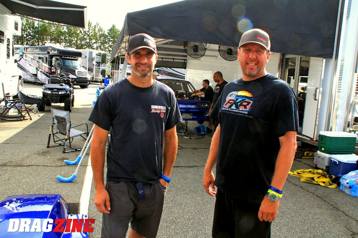 “We made every race but had a bad mulligan race at Norwalk, it didn’t go well for us there, every other race we have done well and pointed well, I think we are averaging over fifty points per race, so our average is good. We have won one race, Joel is there and Rodney is there it’s gonna be a tight race to the finish. We are enjoying ourselves, the car is doing what we are asking of it, just trying do continue doing what we are doing and be consistent. We run a Hameetman Racing Engine small block Chevy with an F1A94 Procharger right now at 3,300 pounds, we are waiting for Procharger to come up with a 91 MM blower to test at lower weight. It’s tough in the heat being that heavy but the car works well and is good as long as the track is decent. Procharger has been phenomenal for me, RPM Transmissions has been right there with me. I can’t thank my crew enough, Mark Gonyaw, my girlfriend Angel Crampton and my brother Sean being at almost every race. So we are enjoying ourselves and having fun” – Brian Keep Pictured from left to right, Brian Keep, Sean Keep and Mark Gonyaw.We stopped by Peter Volpe’s pits this morning to check on how he has been doing this weekend inhis first event of heads up competition. He qualified third but broke a steering arm on the car and missed the last two qualifying sessions. Racecraft sent the parts overnight and they were able to make the repair and first round Saturday coming away with Peter’s first round win. He had to pedal the car to a 5.14 win, despite a sleepy reaction time, over Steve Mogle and will face Todd Moyer in round two. “It was exhilarating, exciting and scary kind of all meshed into one, it was crazy. Josh had told me “the first sixty feet you gotta hang on, then the next hundred is is even worse” and he was one hundred percent right, it was insane, but we are getting it, I can’t thank Josh and his crew and the Proline guys enough for sticking with us and helping us the whole week and in New Hampshire. The guys have been really great, we wouldn’t know what to do if we just got the car and that was it.” – Peter Volpe, with Josh Klugger on the right.John and Hunter Smith are father and son here spectating this weekend from Billa Rica, Georgia and own American Speed Shop which has been open just over a year. They have been coming here for the past few years and Hunter was on the crew with Norman Bryson last year.