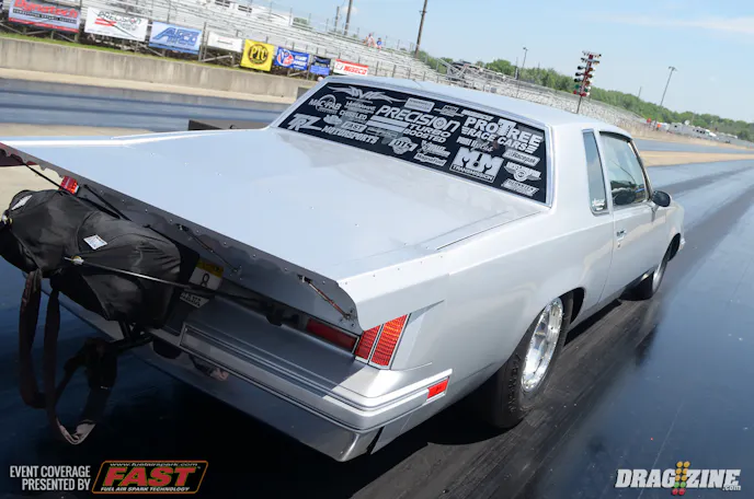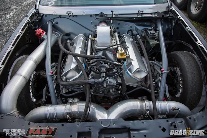 Now the Buick has a 531 cubic inch big-block Chevy short block that was assembled by Pro Line Racing engines powering it. Dusty assembled the top end himself, going with a set of conventional RFD heads. The turbo kit was also built by Dusty and flows boost from a single Precision 118 mm turbo. PTC provided the converter and transmission parts that send the power back to the TRZ fabricated 9-inch rearend. Chris Terry Racing assisted in building the 25.3 chassis that the car now has.