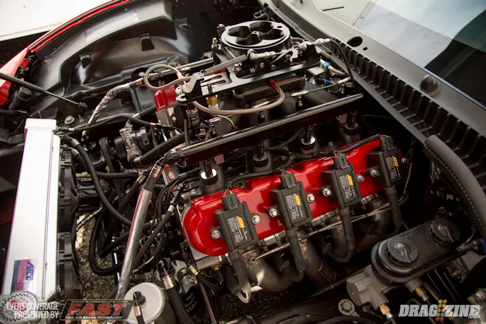 Powering the Corvette is a 440 cubic inch LSX-based nitrous motor that’s backed by a TH400 transmission. To help take all that power, the Corvette has been outfitted Ford 9-inch rearend, but still maintains its IRS suspension configuration. The nitrous kit is homemade with parts from Wilson, Nitrous Outlet, and Induction solutions.