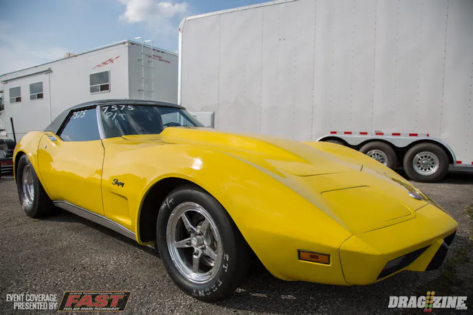 The beauty of Andrew’s Corvette, besides its screaming yellow paint is the simple combo he uses to run the 7.50 Index races locally here in Kentucky. The motor is just a small-block Chevy with a single plane intake, which is backed by a Powerglide transmission. Behind the engine and transmission is a Ford 9-inch rearend and four-link suspension that puts all the power to the track.