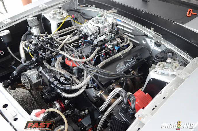 Fast Chassis updated the chassis to its current 25.5 certification after Steve purchased it as a roller. The bullet between the frame rails is a 8.2 deck block, with TFSR Heads, Jessel valvetrain, and a 4150 Quick Fuel carb. The power adder of choice to feed the giggle juice into the motor is an Induction solutions fogger system