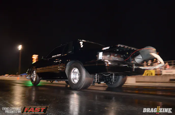 Rick Wetherbee and his “Land Yacht” Impala delivered the ‘wow’ moment of the third round of LDR qualifying, as the car hiked the front wheels and made a move toward the wall. Wetherbee hung with it and clicked off a career best 4.36 at 177 mph to move up to the fourth spot in the order. The quickest Wetherbee had been previously was a 4.43.Frank Mewshaw remains at the top of a fairly tight LDR field after three rounds with his 4.24 from last night. Travis Esselman is trailing closely behind with a 4.26.