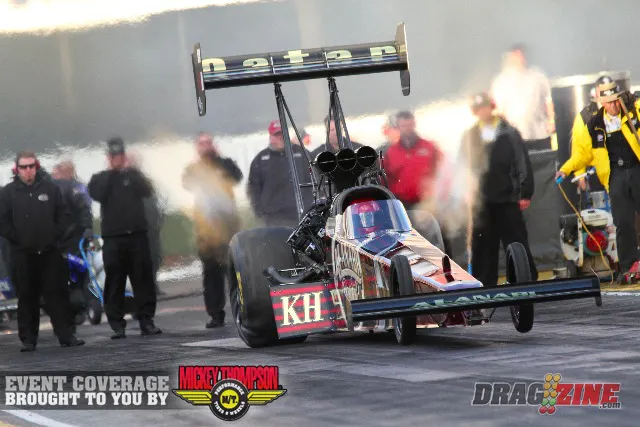 Series points leader Del Worsham qualified second in his Al-Anabi Racing dragster with a 3.823 at 321.65 and Spencer Massey was third in his FRAM/Prestone dragster with a 3.845 at 319.67.