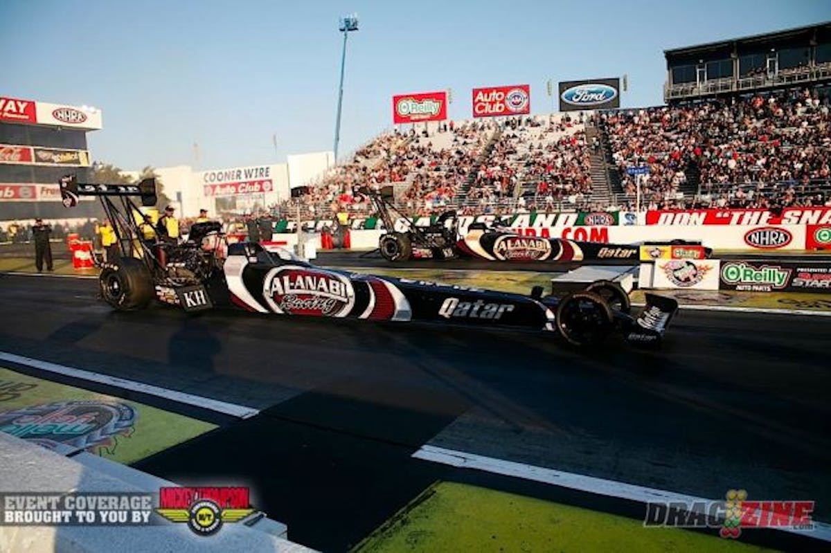 Shawn Langdon in the Al-Anabi Fueler (near lane) still hasn't made the field, while in the other lane you're seeing Brittany Force make her very first run in competition, qualifying 12th with a 3.85 at 293 mph.