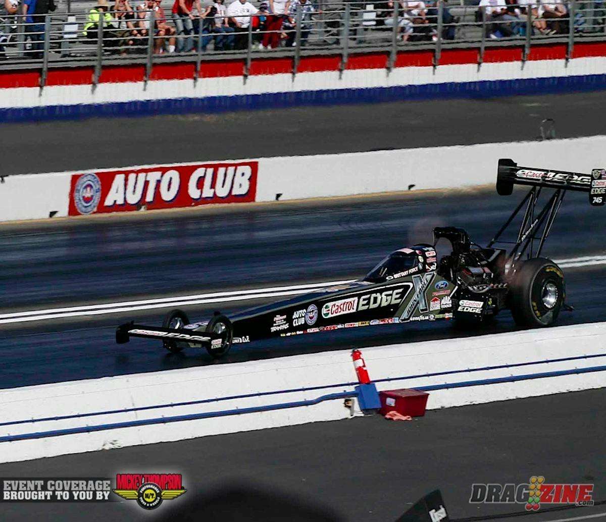 Top Fuel saw rookie Sidnei Frigo’s day end early at the hands of Schumacher, Spencer Massey beaten by Steve Torrence, Antron Brown taking out Larry Dixon Jr., Dave Grubnic over Morgan Lucas, Brandon Bernstein sending rookie Brittany Force to the trailer, Shawn Langdon beating Clay Millican, Doug Kalitta beating Leah Pruett, and Khalid alBalooshi beating Bob Vandergriff.