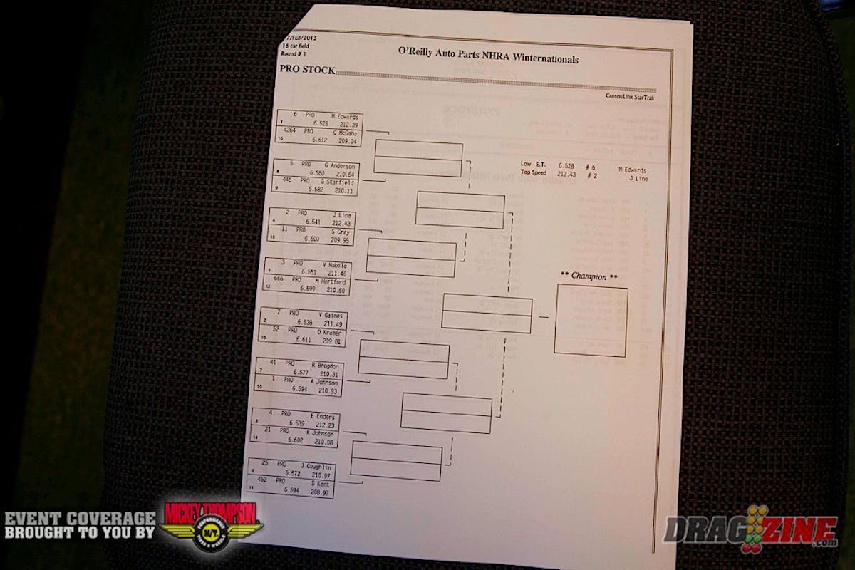 Leading the Pro Stock field is Mike Edwards, who took the top spot in the class for the 42nd time with a performance of 6.528 at 212.39. He will open eliminations against Chris McGaha at an event he has won one time in three final round attempts.