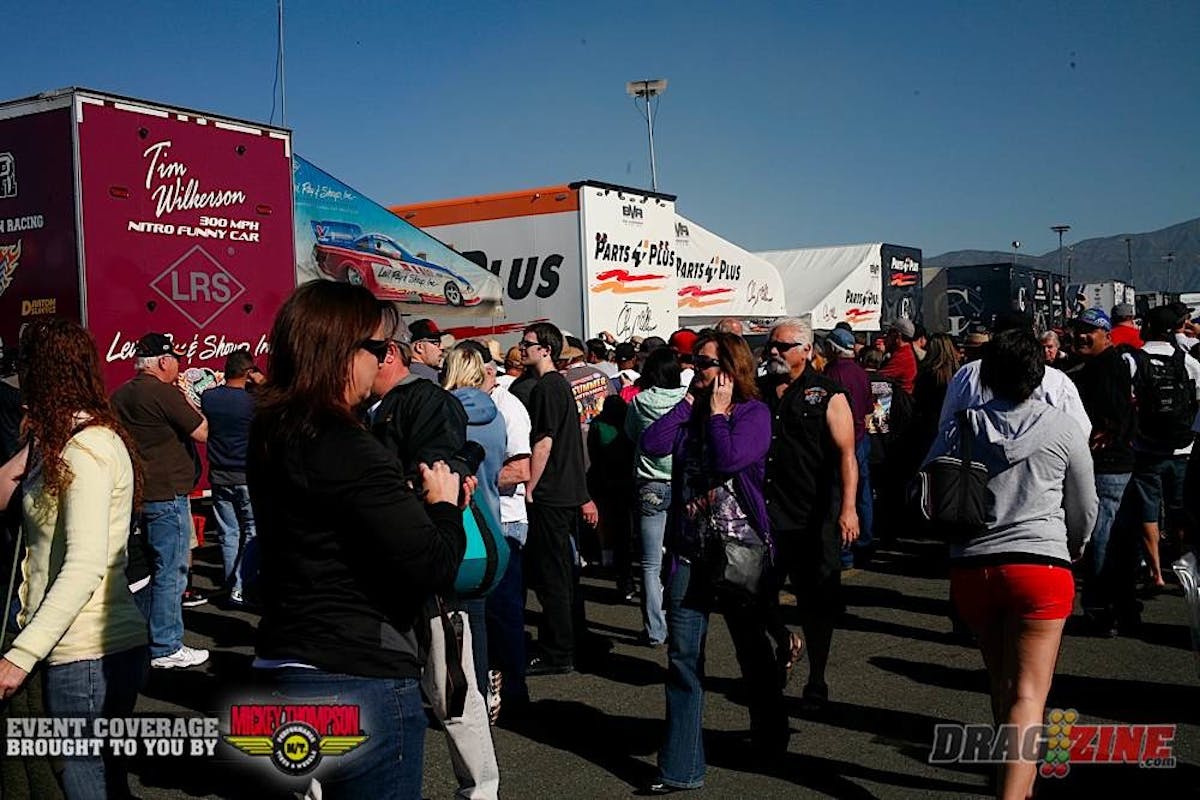 Roaming the pits prior to the first round of Pro class qualifying here at the Auto Club Raceway Pomona is a great time to get up close and personal with the drivers and crew members before the mad rush of the Saturday and Sunday crowds. Here are some tidbits from the pits to get your drag racing weekend started. The Pro classes (Top Fuel, Funny Car, and Pro Stock — Pro Stock Motorcycle doesn’t make a pass today) are scheduled to run at 2:00 pm so check back sometime after that and we’ll give you complete first round coverage.