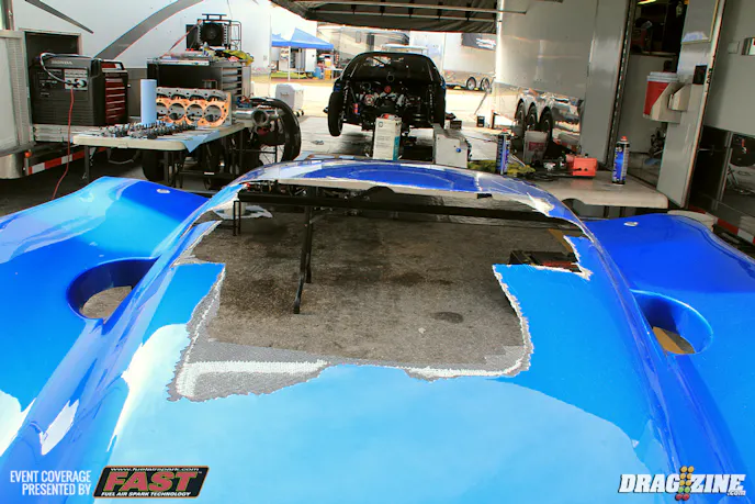 We stopped by John Carinci's pits and spoke with tuner Jason Lee from PTP. Carinci had quite the backfire last night blowing the the intake manifold apart and a hole right through the hood in the process. Teardown found a folded over top ring in the engine but no serious damage. A new piston for that cylinder and new rings all around will have the engine fixed right up. A big thanks to Jeff Lutz for making the repairs to the intake.