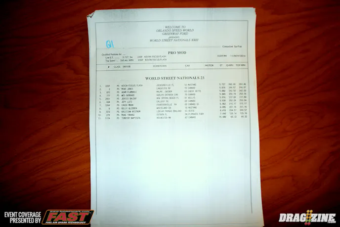 Kevin "Flash" Fiscus took back the Pro Mod Track Record from Tricky Rickie Smith which was set at the 2015 OWSN running a 7.727 at 160.46 MPH for both ends of the record.