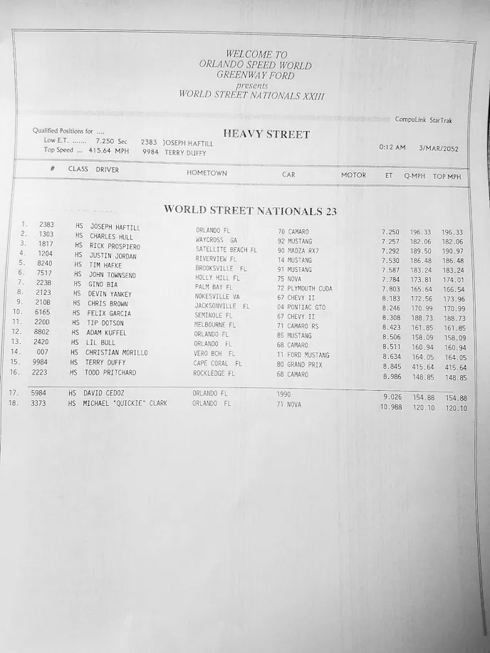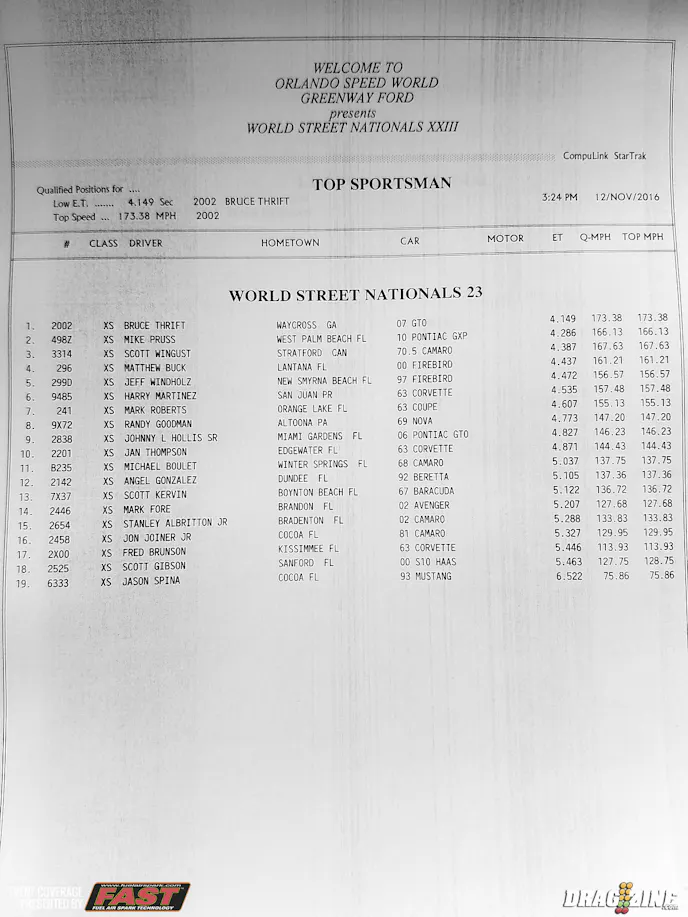 Bradenton Ultra Street 2016 Champion Troy Pirez Jr. arrived today but was unable to stick the car and sits outside the field at twenty second.