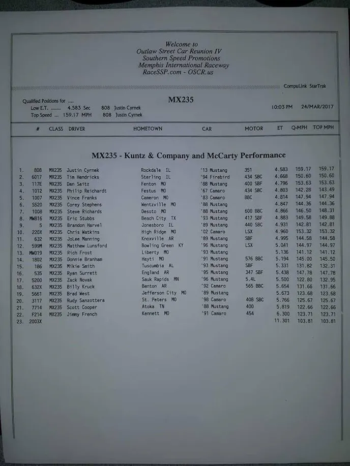 After Justin Cyrnek smashed the MX235 record on Friday he was protested by a racer and subject to a turbo inspection. Cyrnek passed the inspection with flying colors but struck the tires on his bye run and only managed a 5.10 pass.