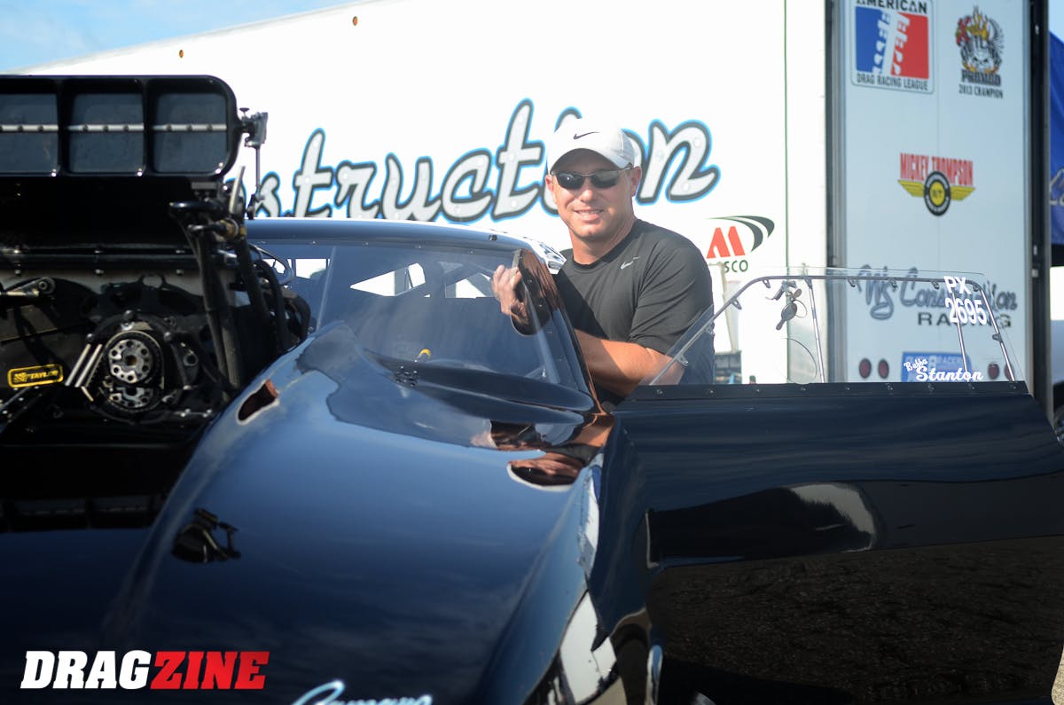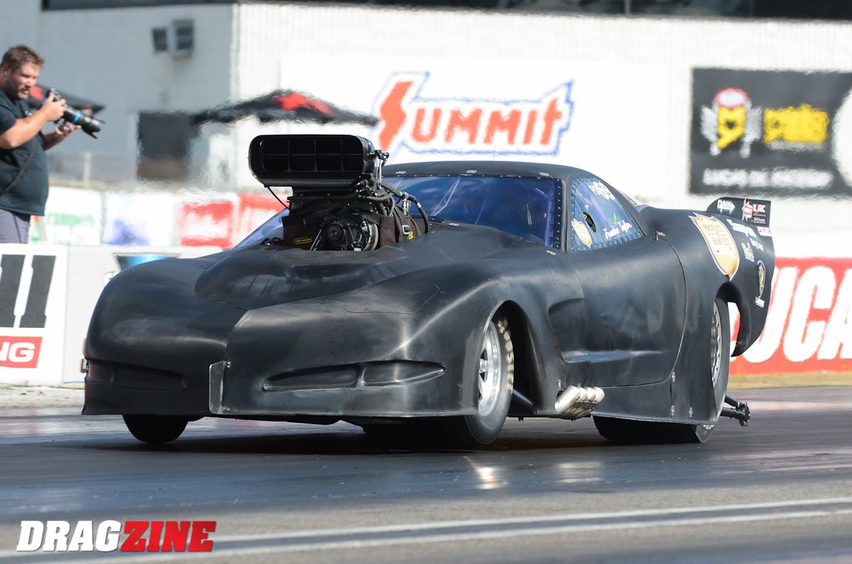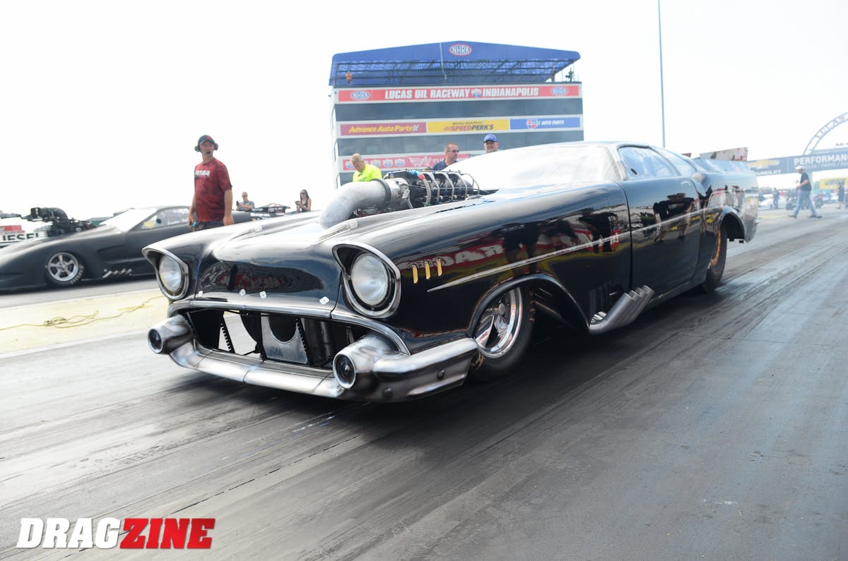 Pro Extreme racer Jason Scruggs got everyone's attention with a major engine detonation and supercharger explosion at the top end during testing thus morning, splintering the windshield in two and damaging the aluminum firewall. Scrugg' crew along with chassis builder Rick Jones were hot-footing it to repair the firewall and replace the engine after the cleanup. Street Out;aws: New Orleans star Kye Kelley and his “Shocker” Camaro are here to make some runs this weekend.Canadian Barry Daniluk made history earlier this year in Valdosta, Georgia when he recorded the firs-ever 3-second run by a naturally-aspirtated, fill-bodied racecar. Daniluk proved it was no fluke by dipping into the three’s again at subsequent races. Citing the warm conditions, he’s a little less than confident he can back it up here at Indy, sharing he expects the car to run in the 4.10 vicinity this afternoon.If you’re watching our Speedvideo livestream, these two icons in the sport will be bringing you the action all weekend: the one and only Al Tucci and his PDRA partner in crime Carl Robinson.Reigning Pro Extreme Motorcycle champion Eric McKinney paced the opening session of qualifying with a 4.09 at 171.40, just a hundredth of a second ahead of Travis Davis’ 4.102.