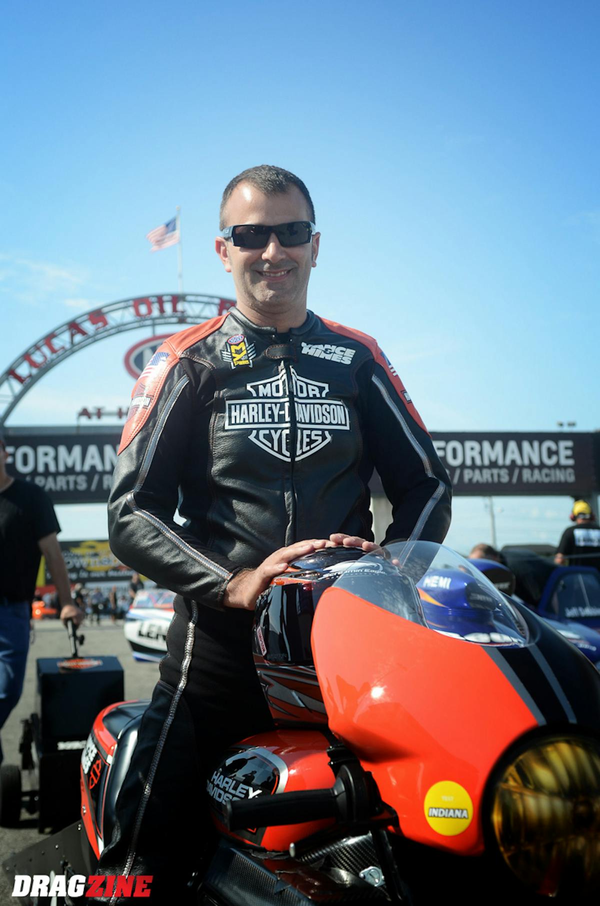 Orange cars a pair ... Pro Nitrous' Jay Cox (left) clicked off a 3.74 this morning in testing, while Jose Gonzalez reeled off a stellar 3.58 at 223 mph. A little star-power here this morning at indy: Top Fuel racer Leah Pritchett is here with her husband, Steve Torrence crewman Gary Pritchett, who is licensing in Jonnie Lindberg’s Top Alcohol Funny Car.Eddie Krawiec along with teammate Andrew Hines are testing their Vance & Hines Harley-Davidson Pro Stock Motorcycles this morning.Top Fuel champ Antron Brown is also here with his son, Anson, and daughter Arianna, competing in the PDRA’s Pro Junior Dragster class.Top Dragster racer Andrew Johnson has purchased new ’57 Chevrolet and stuffed his ProCharger F3-powered mill under the hood. Johnson struck the tires immediately in this morning’s test session, but the car has gotten plenty of attention.Indiana native Dave Hirata will be match racing Pro Extreme’s Jason Scruggs with his A/Fuel Dragster this weekend.