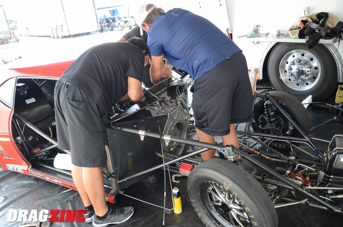 More than 250 cars have filled the legendary Lucas Oil Raceway here in Indianapolis this weekend and they were still rolling in this morning as test and tune got underway. With partly cloudy skies and temperatures expected to peak at around 80 degrees, a great weekend of racing is in store.An incredible amount of tuning talent here: Mike Castellana’s crew chief Frank Manzo (left) and Steve Petty, who is turing the dials on the Jose Gonzalez-driven Q80 Camaro in Pro Extreme.