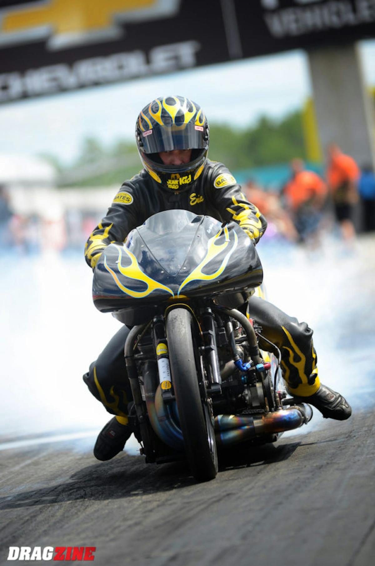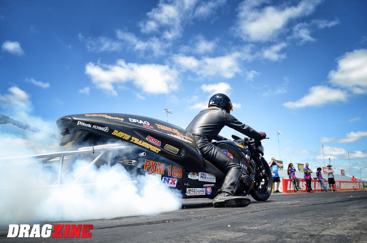 Travis Davis continued his winning streak that began in March when he won the second race of the season. He used his best pass of the weekend, a 4.029 at 174.64, to beat Chuck Wilburn’s 4.116 at 170.62 and win his fourth consecutive final round aboard his Timblin-built Suzuki.