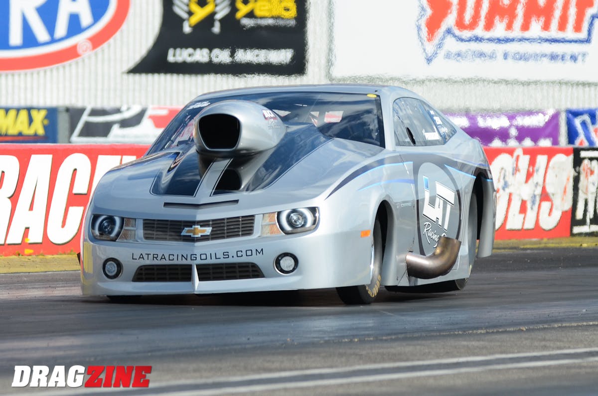 With a few off-weekends from the NHRA Pro Modified trail, Mike Castellana is getting some runs in here at Indy in the Al-Anabi Performance Camaro. Castellana made a low 3.80 run earlier this morning. Lizzy Musi had a transmission failure on her last testing attempt this morning, and father Pat and crew were busy making repairs before the opening session of qualifying coming up this afternoon.Radial vs The World hitter and transmission extraordinaire Mark Micke was in the Q80/El General Racing pit doing some transmission work of his own on Jose Gonzalezs’ Pro Boost Ford Mustang.