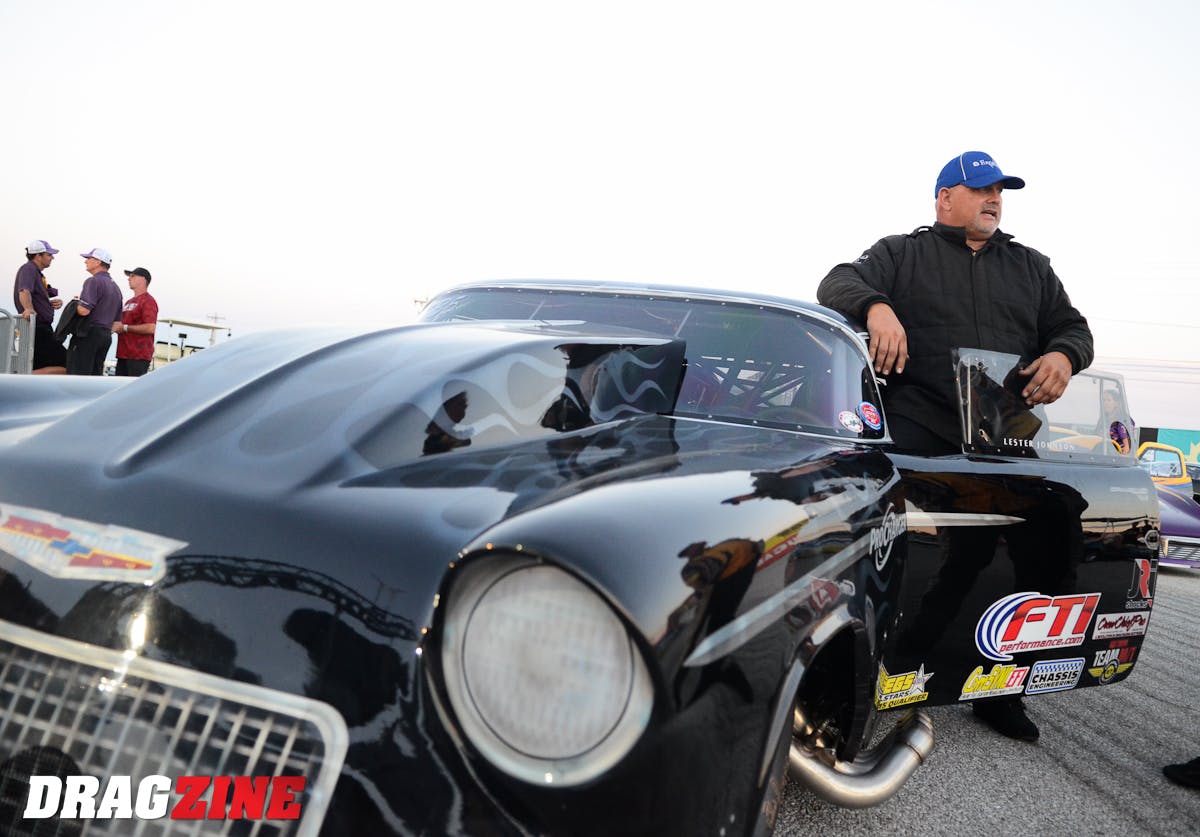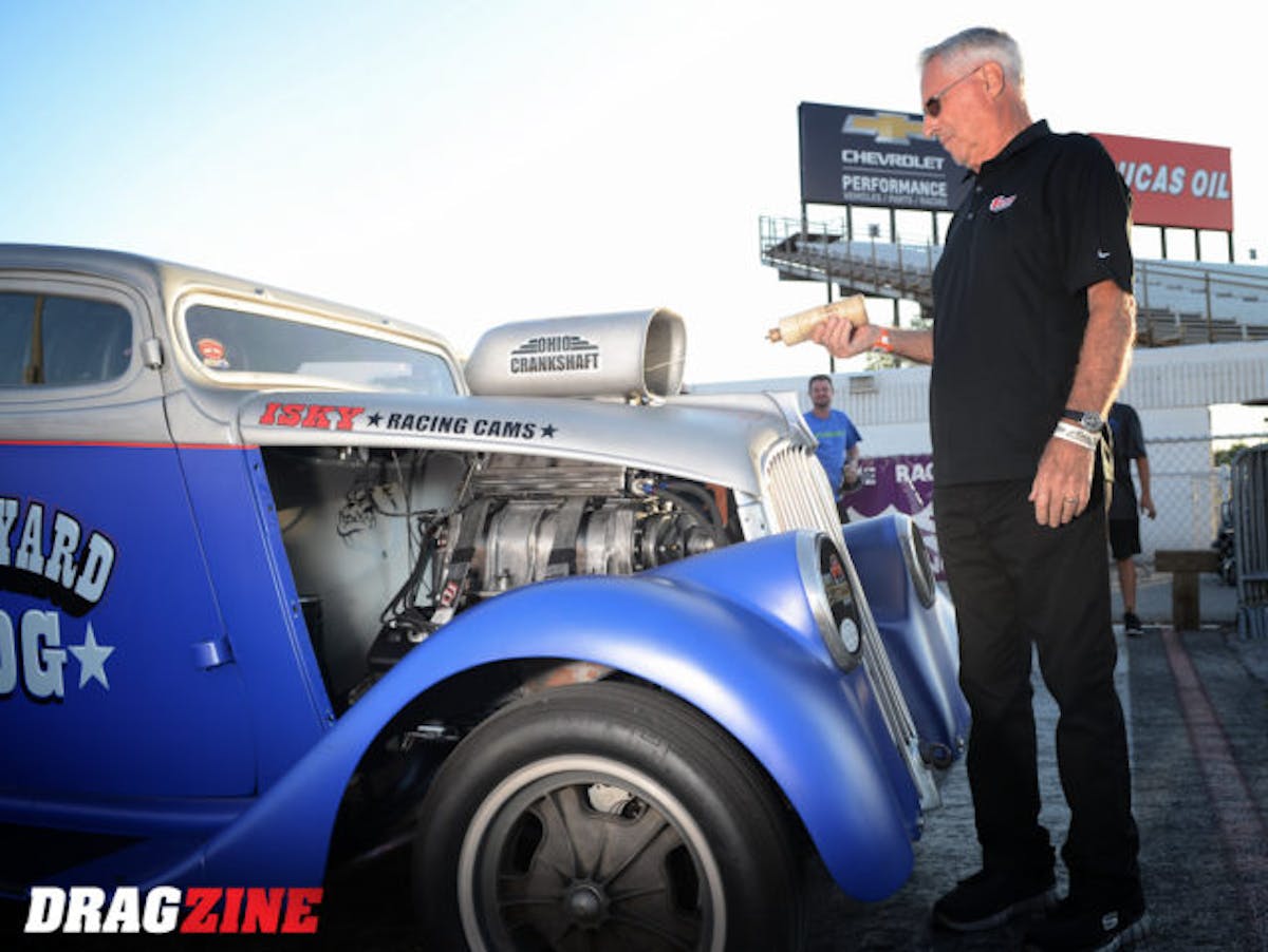 Buddy Perkinson (left) and James Hancock were but two of many racers who found themselves crossed up and off the throttle in the opening session. Legendary drag racer and engine builder Jim Oddy has his “Junkyard Dog” AA/Gasser, driven JR Ward, here as part of the Gasser exhibition this weekend.