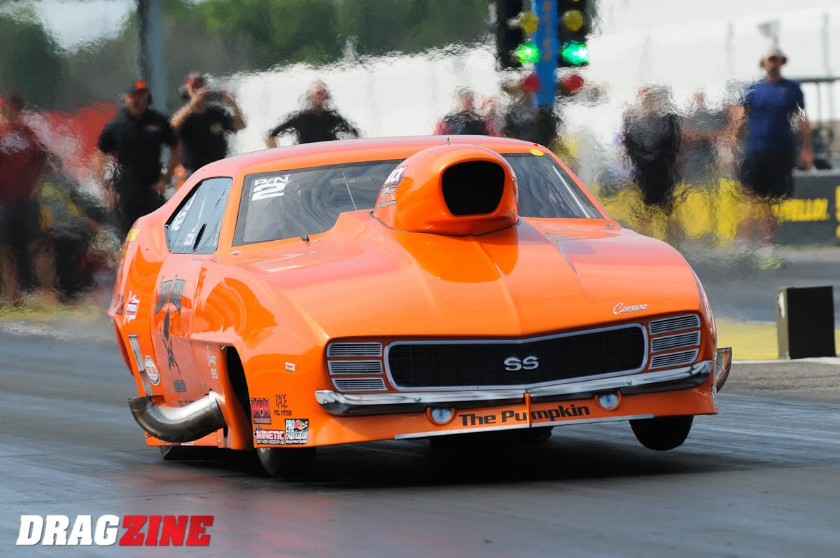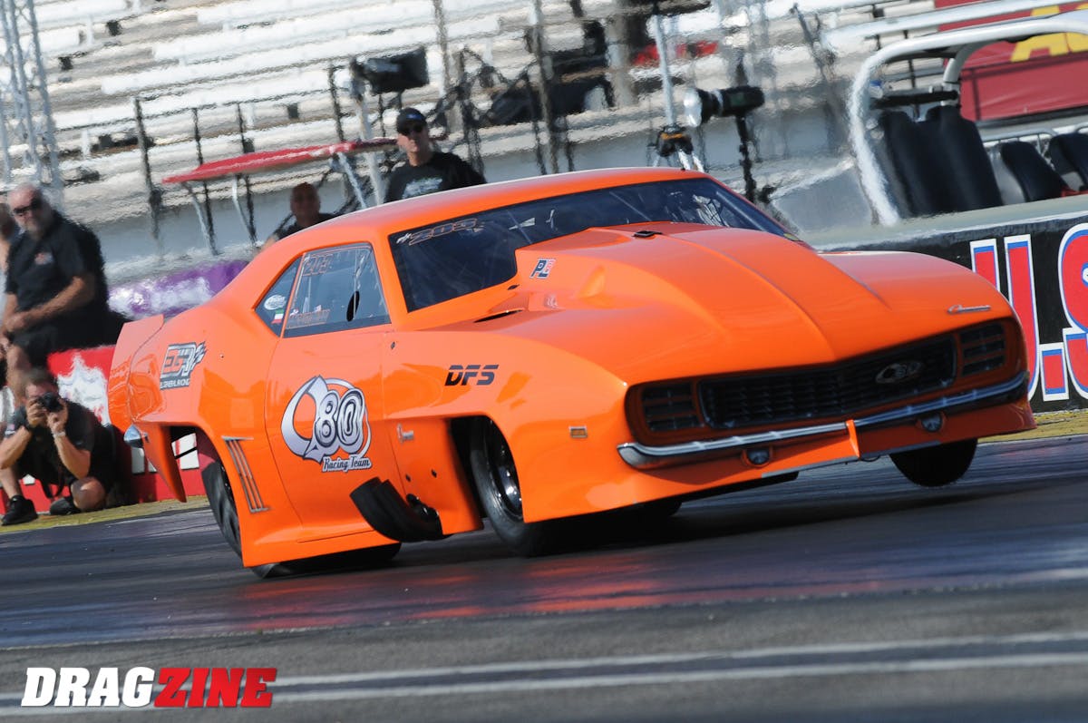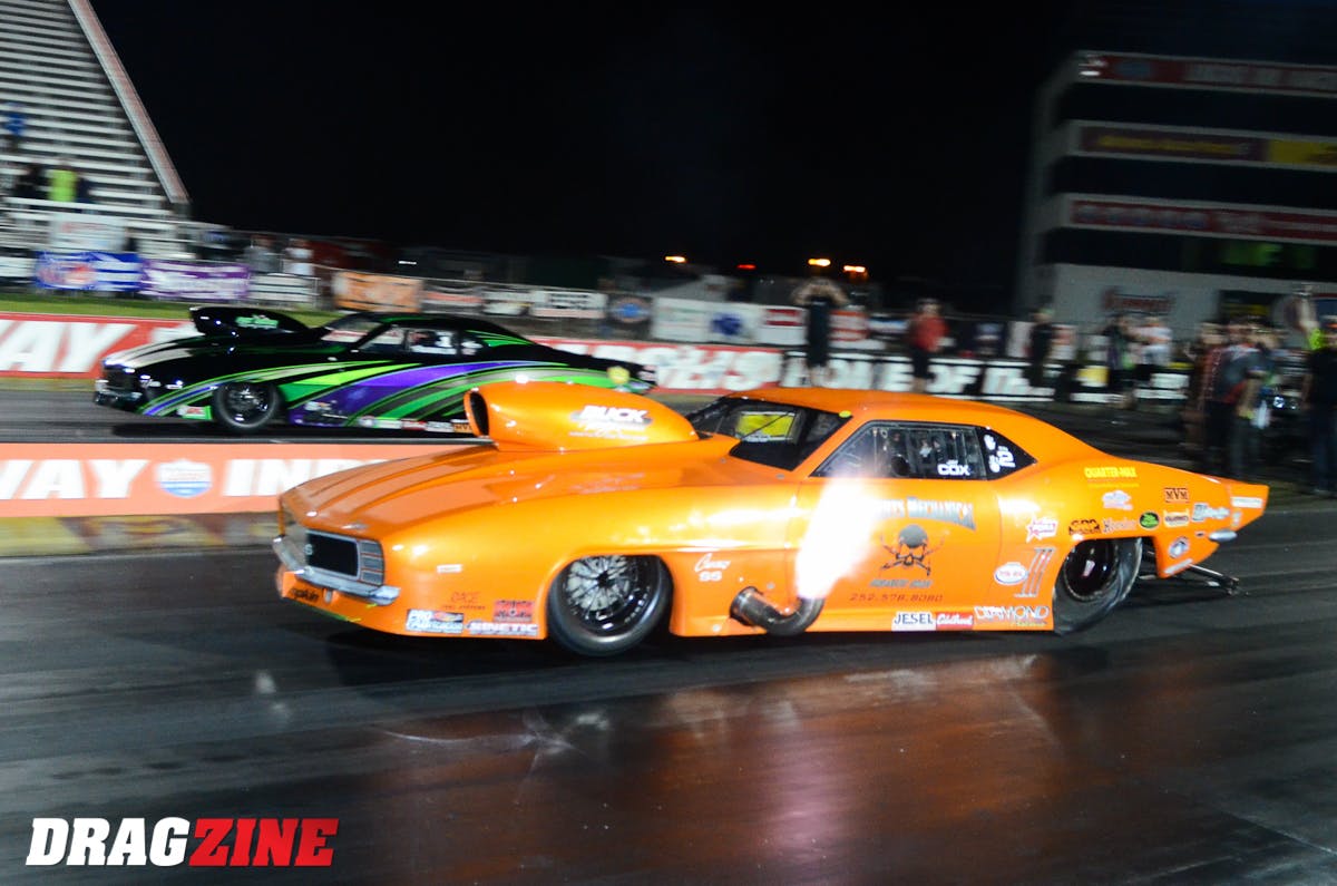 For the second race in a row, Jay Cox in his Clements Mechanical-backed “Pumpkin” ’69 Camaro defeated the “Jungle Rat” ’69 Camaro of defending world champion Tommy Franklin in the Pro Nitrous final round. Cox uncharacteristically struggled in qualifying, while Franklin led the field, but it was Cox who came out with the event win. The Buck-powered “Pumpkin” used a holeshot to defeat Franklin’s Musi-motored “Jungle Rat” in a 3.709-to-3.708 final-round decision.