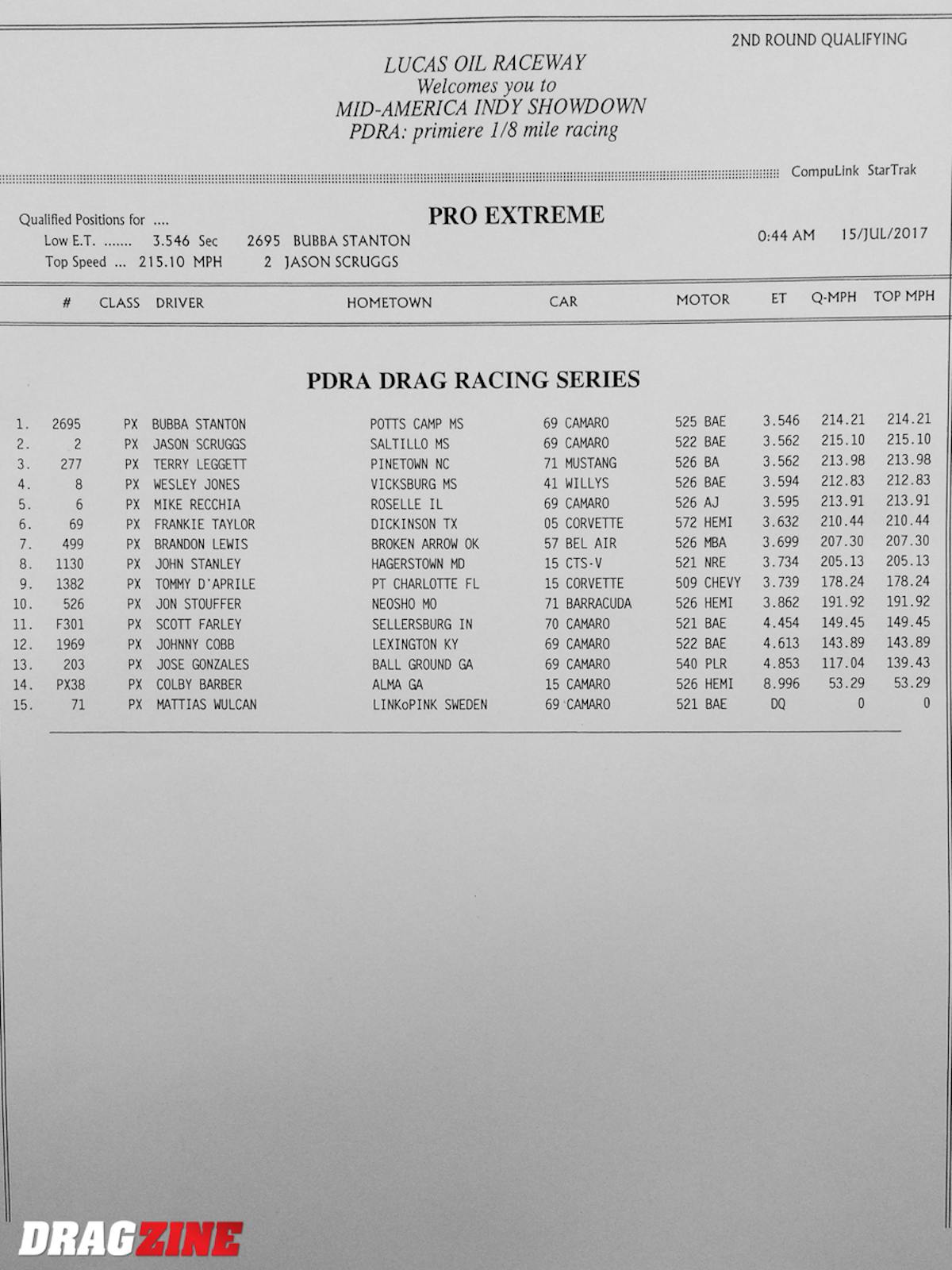 Mississippi racer Bubba Stanton topped a stellar round of Pro Extreme qualifying last night, as his 3.54 at 214.21 mph.