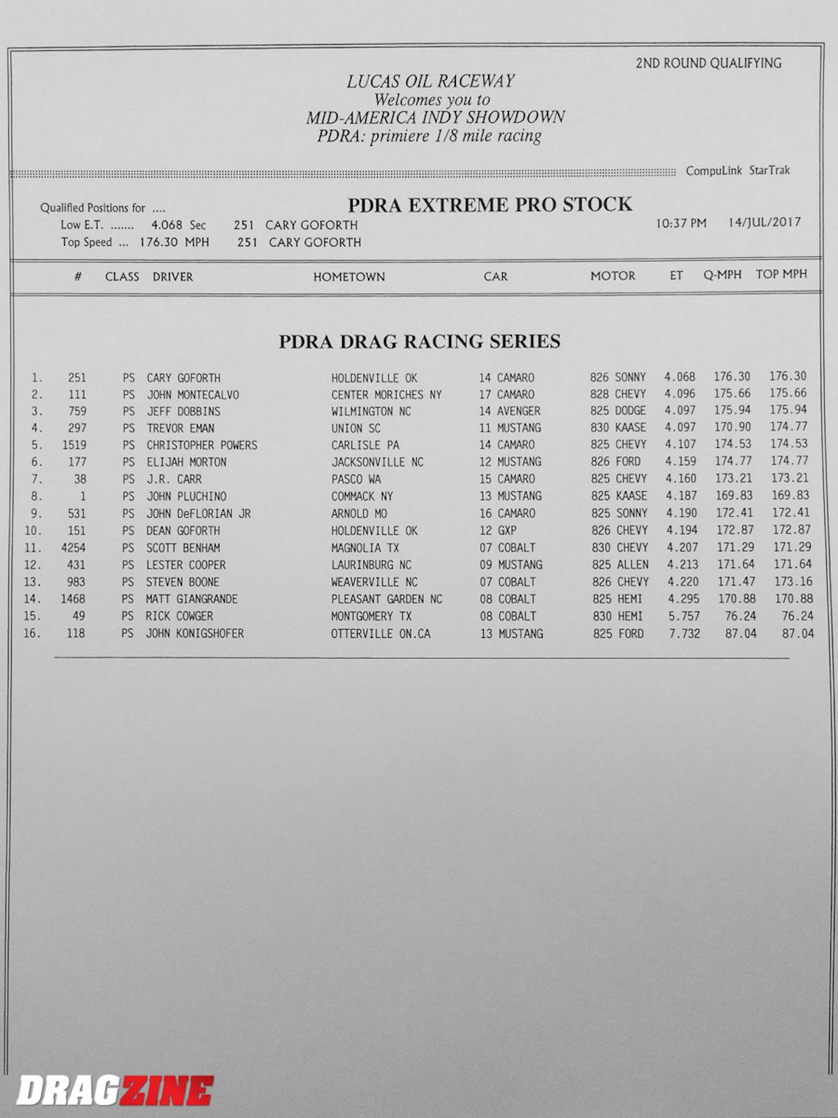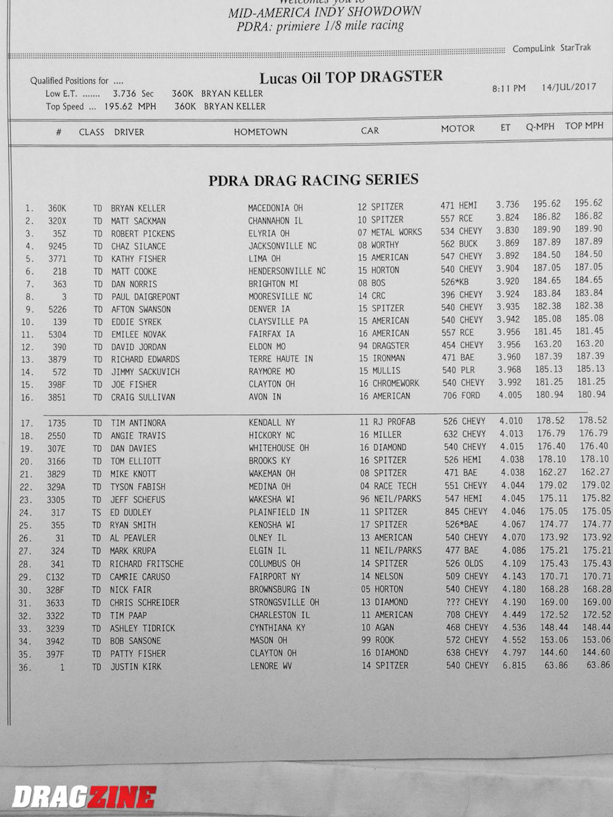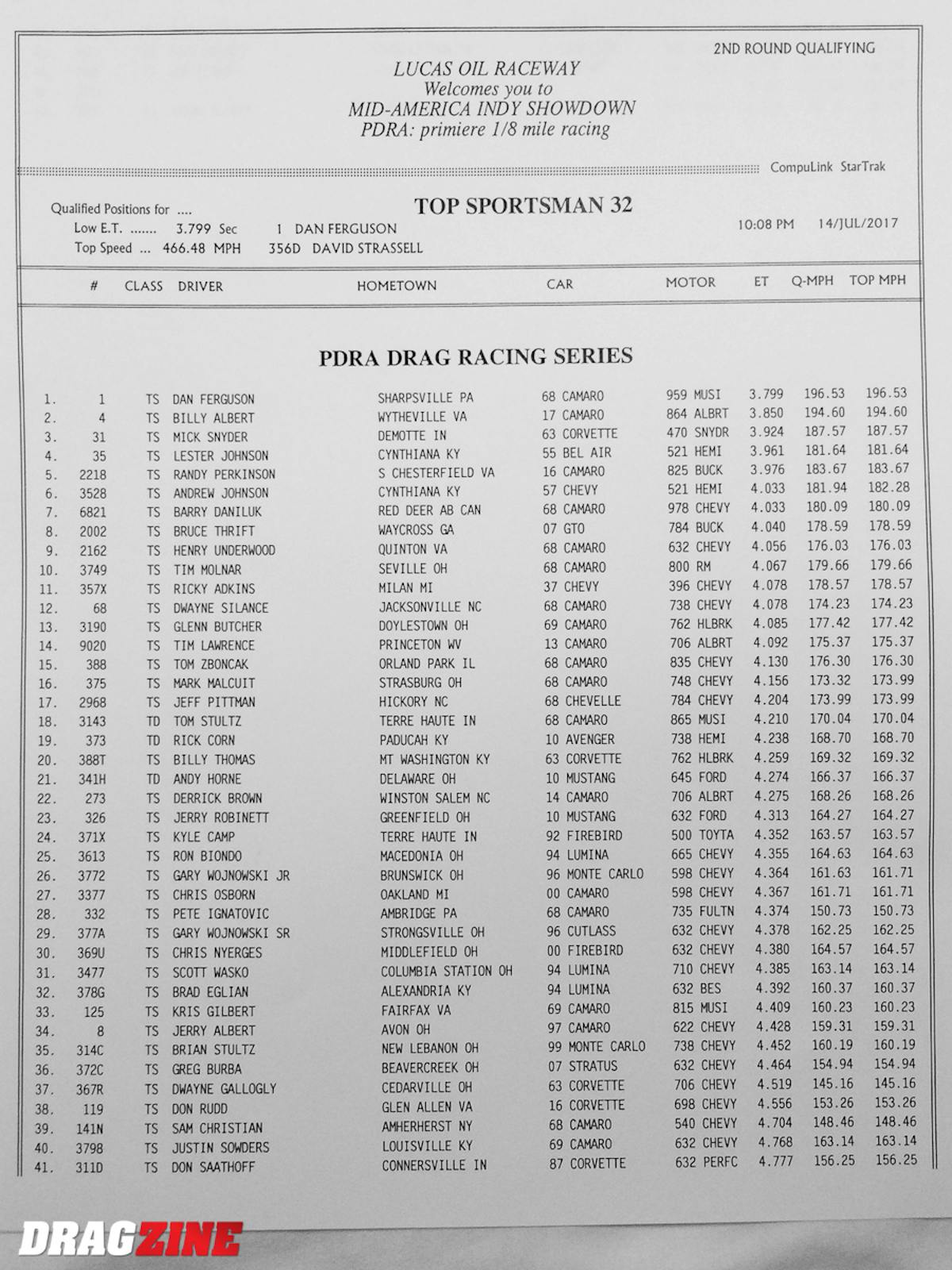 A total of 45 Top Sportsman cars attempted to qualify at the Mid-America Indy Showdown, leading PDRA officials to add a Quick 32 field in addition to the Elite 16 program. The Quick 32 event win went to Jeff Pittman over a red-lighting Gary Wojnowski Jr.